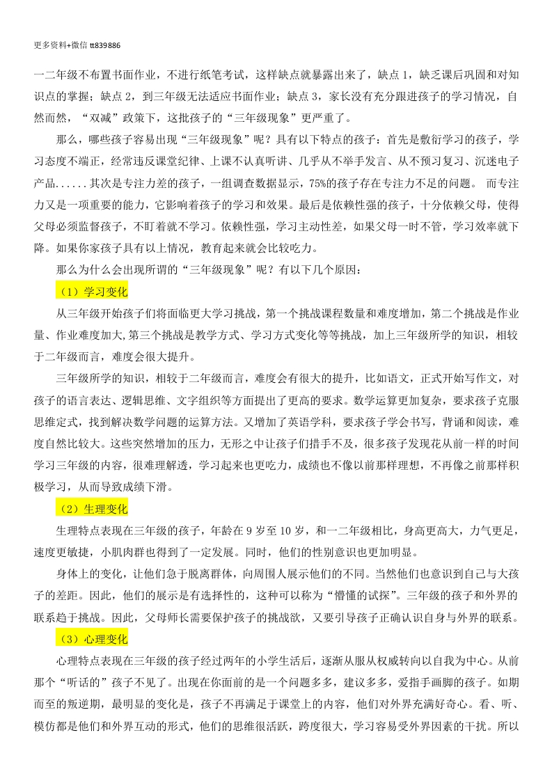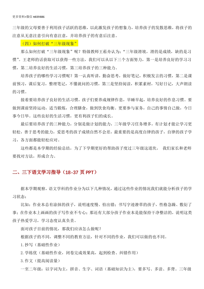 更多资料+微信t839886【三上】【让生命之花绽放光彩】期末家长会发言稿前言、目录(1-4页PPT)首先在家长会开始之前,先给大家提出几点小建议:01.请您在会议期间把手机调至静音状态,把手机装进口袋,不要看手机:02.会议期间别打电话、不随意走动:03.若有要紧事情需要出去,请直接后门出后门进:04.有任何疑问,可以在家长会后与我私聊。温馨提示:按学号找到座位(孩子精心制作了姓名牌)孩子们认真填写的心里话一定要精心读呀!大家好,我是三(3)班的班主任兼语文老师,今天,非常高兴和各位家长相聚在三(3)班这个温暖有爱的大家庭。首先请允许我对各位家长的到来表示热烈的欢迎,今天您们能从百忙之中抽出宝贵的时间来参加家长会,足以看出你们对我校教育工作的支持,对孩子成长的关心。教育是一场美丽的相遇,更是相遇后的相知遇见,是幸福的启程老师、学生、家长之间双向奔赴才是教育最好的模样期待大家的同心、同行。在期末考试后学校安排这样的一次家长会,让我们聚在一起,是为了共同的目的,为了我们的孩子,共同探讨了解这个阶段孩子要注意的情况和问题。接下来正式进入我们的主题:今天我们一共要从以下4个方面来交流:第一:聊聊三年级现象:第二:寒假超车:三下语文学习指导,第三:走进我们的大家庭,第四:家校共育:陪孩子跨越“分水岭”一、聊聊三年级现象(1-17页PPT)三年级现象是什么样子的呢?教育界流传这样一句话:一二年级相差不大,三四年级两级分化,五六年级天上地下。这里说明三年级是整个小学的分水岭,它的重要性就不言而喻了。本学期度过了三年级上学期,步入三年级后,很多家长会发现孩子有以下状况:不爱学习,成绩下滑,不阅读,作业乱写,爱顶嘴,作业不会写了。这就是我们现在所谓的“三年级现象”。加上这一批孩子受“双减”政策的影响,情况就更糟了,因为根据“双减”政策相关要求:小学