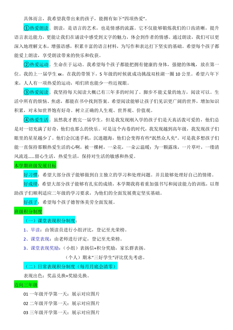 【三上】【语文】【迈向三年级开启新篇章】开学家长会-发言稿上一学期成绩己经成为过去,我们要重结果,更要重视过程,我们一起向未来!目录:01迈向三年级02新学期新目标03语文共进步04家校共携手05安全共保障一、迈向三年级暑假收心总结家长如何帮助孩子收心?(总结、调整、谈心、计划和准备)首先,孩子在暑假生活和学习状况和孩子们进行总结。然后,调整好孩子的作息时间和饮食生活习惯。接着,和孩子谈谈心,了解孩子对新学期的打算。最后,制定新学期计划和准备好学具。让孩子尽快转换角色,从暑假收心,适应学校生活。认识老师班主任、语文老师联系方式数学老师联系方式英语老师联系方式认识班主任我叫,是我们三()班老师,从事教师职业已经有x年,有着丰富的教学经验。接下来的5年,我会尽己所能,陪伴孩子们成长。用心浇灌,陪伴他们从一棵幼苗,成长为挺立的小树:从牙牙学语的稚童,成长为xx学校的大美少年!我想在座的家长或多或少都有一些自己的教育理念:望子成龙成凤:黄金棍下出好人;“放养型”:“内卷型”;顺其自然型…我简单说说我的教育理念吧。我觉得在小学阶段,孩子的童年只有一次,很是珍贵,我个人还是希望他们能够拥有一个快乐的童年,德智体美劳全面发展。