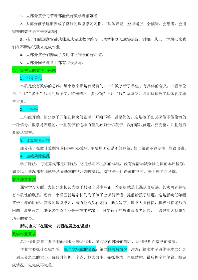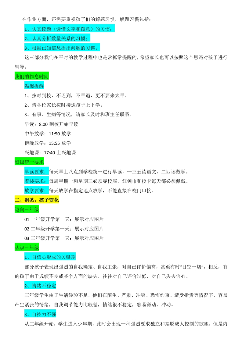 【三上】【北师大版数学】【数学新篇共创辉煌】开学家长会-发言稿上一学期成绩已经成为过去,我们要重结果,更要重视过程,我们一起向未来!目录:01解锁:新三年级02洞悉:孩子变化03把握:数学学习04探讨:助力成长、解锁:新三年级认识我们的班级我班有35名同学,其中男生有20人,女生15人,虽然有个别学生比较调皮,但是大多数学生非常懂事、听话,在个人良好习惯养成方面取得了很大的进步。班内同学团结友爱,互帮互助,形成了良好的班风。学生学习多数比较认真、努力,形成了良好的学风。暑假收心总结家长如何帮助孩子收心?(总结、调整、谈心、计划和准备)首先,孩子在暑假生活和学习状况和孩子们进行总结。然后,调整好孩子的作息时间和饮食生活习惯。接着,和孩子谈谈心,了解孩子对新学期的打算。最后,制定新学期计划和准备好学具。让孩子尽快转换角色,从暑假收心,适应学校生活。认识老师语文老师(班主任)手机号:1234567789数学老师手机号:1234567789英语老师手机号:1234567789我的教学理念本学期经常和孩子们说:上课好好学,下课好好玩!所以即使一个星期只有六节数学课,打了铃马上就会下课,但是前提上课必须听,第二句话是:学明白数学,事半功倍!数学只有学明白了才会越学越有趣,越学越轻松,我们班级的课堂练习全部是关于课堂教学内容,谁没有认真听,一做作业就知道了,因此只要认真学习,越学越轻松,越学越自信。二年级这一年的进步