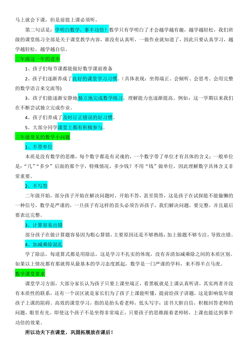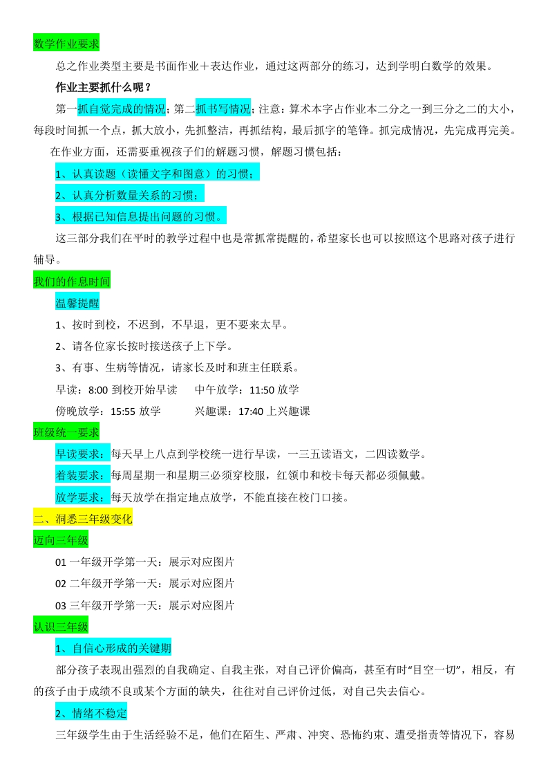 【三上】【人教版数学】【洞悉变化共助成长】开学家长会-发言稿开场白:三年级和一、二年级一样,对于孩子们而言,最重要的还是行为习惯的培养,与此同时,对的要求也有所提高。与此同时,对学习技能方面的要求也有所提高。这不仅仅是对老师、孩子们提出要求,也对家长们提出了新的要求作为本班的数学老师,我也一直在探索,如何尽己所能,使枯燥的数学课变得生动活泼,让孩子们乐意学数学,感受数学的多姿多彩,激起孩子们探索的欲望,享受成功的喜悦。为孩子之后的学习打好基础。目录:1班级情况分析2洞悉三年级变化3把握三年级数学4共助孩子们成长班级情况分析认识我们的班级我班有35名同学,其中男生有20人,女生15人,虽然有个别学生比较调皮,但是大多数学生非常懂事、听话,在个人良好习惯养成方面取得了很大的进步。班内同学团结友爱,互帮互助,形成了良好的班风。学生学习多数比较认真、努力,形成了良好的学风。暑假收心总结家长如何帮助孩子收心?(总结、调整、谈心、计划和准备)首先,孩子在暑假生活和学习状况和孩子们进行总结。然后,调整好孩子的作息时间和饮食生活习惯。接着,和孩子谈谈心,了解孩子对新学期的打算。最后,制定新学期计划和准备好学具。让孩子尽快转换角色,从暑假收心,适应学校生活。认识老师语文老师手机号:1234567789数学老师(班主任)手机号:1234567789英语老师手机号:1234567789我的教学理念本学期经常和孩子们说:上课好好学,下课好好玩!所以即使一个星期只有六节数学课,打了铃
