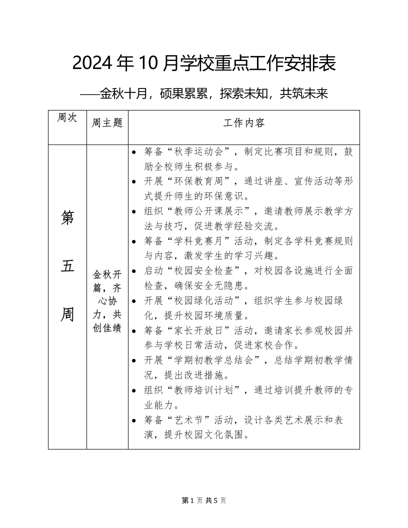 2024年10月学校重点工作安排表金秋十月,硕果累累,探索未知,共筑未来周次周主题工作内容·筹备“秋季运动会”,制定比赛项目和规则,鼓励全校师生积极参与。开展“环保教育周”,通过讲座、宣传活动等形式提升师生的环保意识。第组织“教师公开课展示”,邀请教师展示教学方法与技巧,促进教学经验交流。筹备“学科竞赛月”活动,制定各学科竞赛规则与内容,激发学生的学习兴趣。五金秋开·启动“校园安全检查”,对校园各设施进行全面篇,齐检查,确保安全无隐患。心协开展“校园绿化活动”,组织学生参与校园绿周力,共化,提升校园环境质量。创佳绩·筹备“家长开放日”活动,邀请家长参观校园并参与学校日常活动,促进家校合作。开展“学期初教学总结会”,总结学期初教学情况,提出改进措施。·组织“教师培训计划”,通过培训提升教师的专业能力。·筹备“艺术节”活动,设计各类艺术展示和表演,提升校园文化氛围。第1页共5页