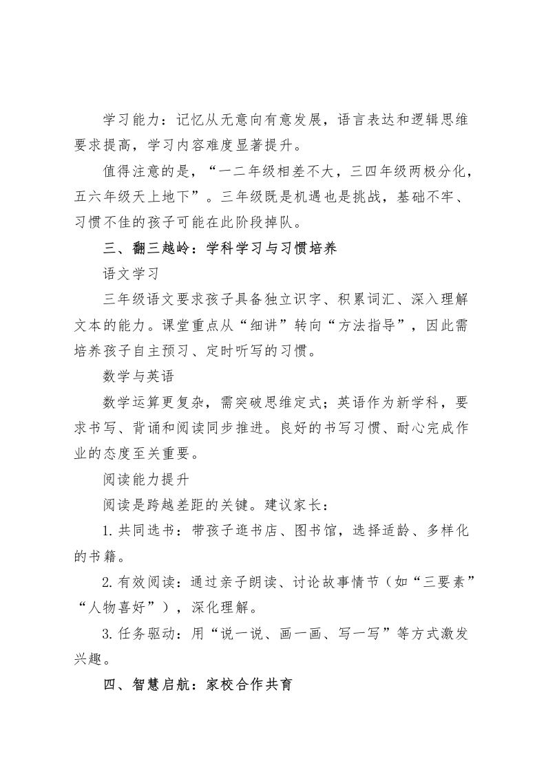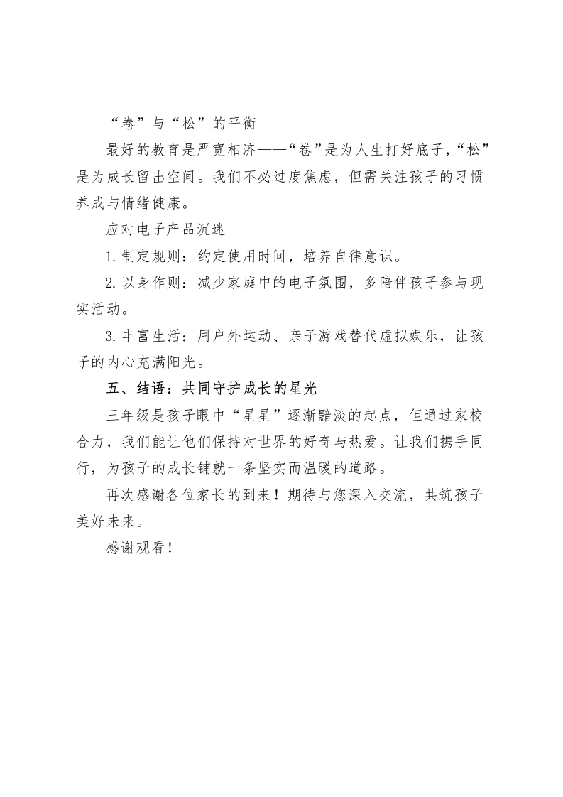 2025年秋季三年级上学期家长会发言稿(家校携手,共赴成长之约)尊敬的各位家长朋友们:大家下午好!感谢大家在百忙之中抽出时间参加本次家长会。我是三年级班主任秦老师。今天我们齐聚一堂,共同探讨孩子们成长的新篇章一一三年级,这一承上启下的关键阶段。一、温暖相迎:我们的班级与教育理念我们班是一个由41名同学组成的温暖集体,其中女生19位,男生22位。孩子们在校的每一天都充满闪光瞬间,他们热爱朗读、运动、阅读与生活。我们始终坚持“德智体美劳全面发展”的育人目标,希望每个孩子都能拥有健康的身心、阳光的性格,以及探索世界的热情。语文刘老师(电话:)和数学王老师(电话:)将与我一齐陪伴孩子们成长。我们坚信,童年的珍贵在于快乐与成长并存,而家校合作是实现这一目标的核心力量。二、成长密码:三年级的身心变化与挑战三年级是孩子从低年级向高年级过渡的关键期,他们的生理、心理及学习能力正经历显著变化:生理特点:大脑发育趋于成熟,自我控制能力增强,但仍需引导。心理特点:个性差异增大,情绪波动明显,需家长与老师共同关注其心理需求。
