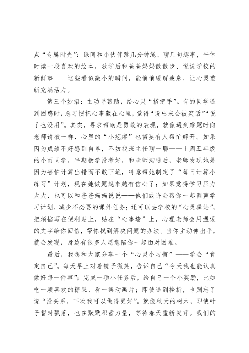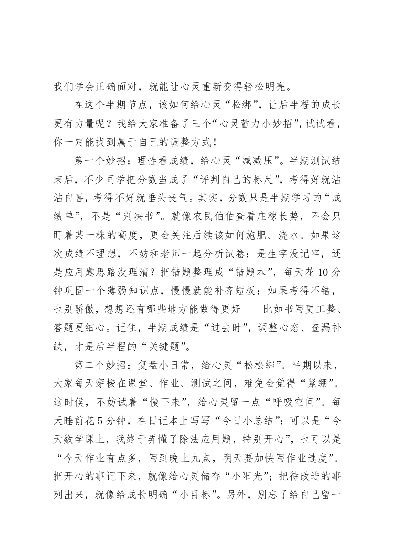 半期拾光暖心灵,蓄力成长再出发一秋季学期半期小学校长国旗下心理健康教育讲话尊敬的老师们、亲爱的同学们:大家早上好!当校园里的银杏叶铺满小径,桂花的甜香渐渐淡去,我们的秋季学期也悄悄走到了半期节点。这段时间里,大家在课堂上认真听讲、在作业本上奋笔疾书,还经历了半期测试的检验。此刻,或许有同学为取得的进步满心欢喜,或许有同学因暂时的失利有些失落,也有同学在日复一日的学习中感到些许疲惫一一就像秋天的作物在生长中需要调整养分供给,在这个承前启后的关键阶段,我们的心灵也需要停下脚步“充充电”,好好呵护。今天,我们就聊聊半期节点上,如何守护心理健康,为后半程的成长积蓄力量。孩子们,半期是个特别的“加油站”:它像一面镜子,帮我们看清前半学期的学习收获一一哪些知识已经牢牢掌握,哪些地方还需要加强;它也像一个岔路口,提醒我们该调整节奏、校准方向。这段时间里,我发现有些同学的状态悄悄发生了变化:有的同学因为半期测试成绩不理想,上课不敢举手,甚至害怕面对老师和家长;有的同学觉得学习任务越来越重,每天忙着赶作业,连喜欢的课间游戏都没了兴致;还有的同学看到身边伙伴进步快,悄悄给自己施加压力,晚上辗转难眠…这些藏在心里的“小纠结”,其实是成长过程中的正常现象,只要