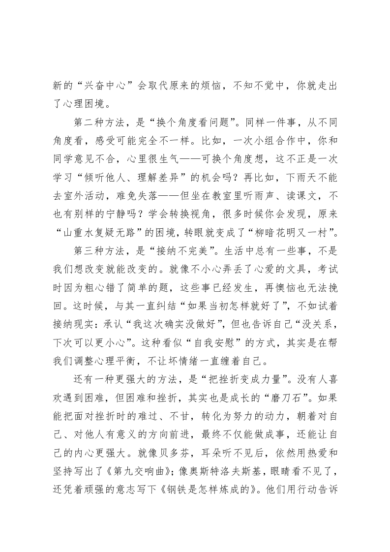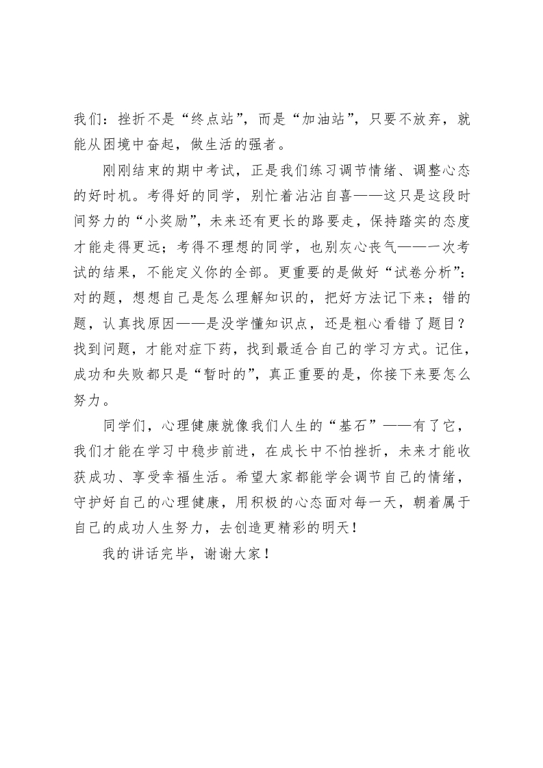 期中心理健康教育国旗下讲话:守护心理健康,点亮成功人生尊敬的老师们,亲爱的同学们:大家上午好!有位哲学家曾说:“不善于驾驭自己情绪的人总会有所失。”这句话深刻地道出了情绪与人生的紧密联系。良好的情绪,就像助推器,能让我们在学习中更专注、在生活中更快乐、在追逐目标时更有动力;可一旦被不良情绪左右,不仅会让我们内心烦躁、做事分心,长期下来还会影响身心健康。生活本就是一场充满各种滋味的旅程一一有考出好成绩的喜悦,也有遇到挫折的沮丧;有和朋友相处的温暖,也有偶尔产生矛盾的失落。情绪就像天气,难免会有“阴雨天”。但重要的是,我们要学会做情绪的主人,用理智“撑伞”,及时走出心理的“小鸟云”,保持积极健康的心态。只有这样,我们心中那艘“奋斗之舟”,才能稳稳地朝着理想的方向航行。那么,当坏情绪来临时,我们该如何调节呢?其实有很多简单又实用的方法:第一种方法,是“转移注意力”。当你因为一件事难过、焦虑,脑子像被“卡住”一样反复想不开时,不妨试着把注意力转到别的事情上。比如,难过时去操场跑两圈,让汗水带走烦恼;焦虑时画幅画、读本喜欢的书,让有趣的事占据你的思绪。这就像大脑里有个“兴奋中心”,当你把注意力转移到新事物上,