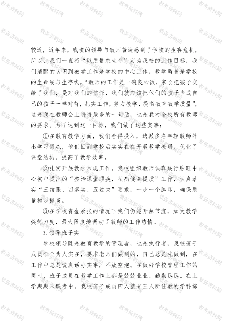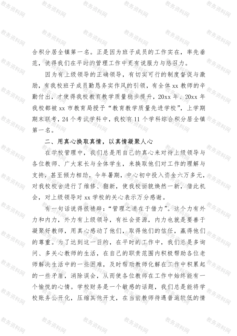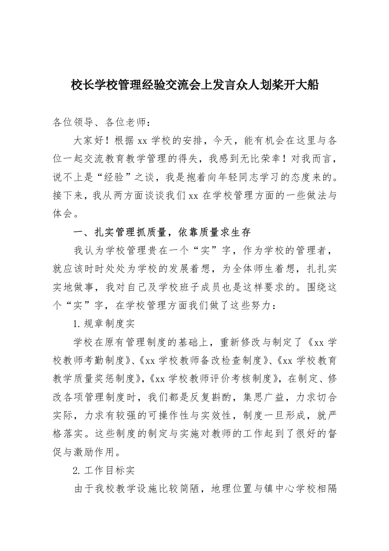 校长学校管理经验交流会上发言众人划桨开大船各位领导、各位老师:大家好!根据Xx学校的安排,今天,能有机会在这里与各位一起交流教育教学管理的得失,我感到无比荣幸!对我而言,说不上是“经验”之谈,我是抱着向年轻同志学习的态度来的。接下来,我从两方面谈谈我们xx在学校管理方面的一些做法与体会。一、扎实管理抓质量,依靠质量求生存我认为学校管理贵在一个“实”字,作为学校的管理者,就应该时时处处为学校的发展着想,为全体师生着想,扎扎实实地做事,我对自己及学校班子成员也是这样要求的。围绕这个“实”字,在学校管理方面我们做了这些努力:1.规章制度实学校在原有管理制度的基础上,重新修改与制定了《xx学校教师考勤制度》、《xx学校教师备改检查制度》、《xx学校教育教学质量奖惩制度》,《Xx学校教师评价考核制度》,在制定、修改各项管理制度时,我们都是反复斟酌,集思广益,力求切合实际,力求有较强的可操作性与实效性,制度一旦形成,就严格落实。这些制度的制定与实施对教师的工作起到了很好的督促与激励作用。2.工作目标实由于我校教学设施比较简陋,地理位置与镇中心学校相隔