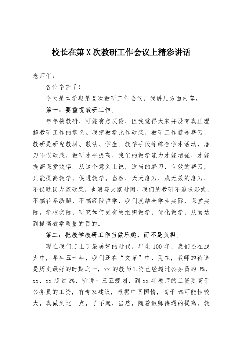 校长在第X次教研工作会议上精彩讲话老师们:各位辛苦了!今天是本学期第X次教研工作会议,我讲几方面内容。第一:要重视教研工作。年年搞教研,可能有点厌倦,但我觉得大家并没有真正理解教研工作的意义。我把教学比作砍柴,教研工作就是磨刀,教研是研究教材、教法、学生、教学手段等综合学术活动,磨刀不误砍柴,教研水平提高,我们的教学能力才能增强,才能提高课堂效率。从这个意义上说,适当的磨刀,有效的磨刀,只能提高教学,促进教学。当然,天天磨刀,或无效的磨刀,不仅耽误大家砍柴,也浪费大家时间。我们的教研不追求形式,不搞花拳绣腿,不搞经院哲学,我们就结合学生实际,课堂实际,学校实际,研究如何更有效组织教学,优化教学,从而达到提高教学质量的目的。第二:把教学教研工作当做乐趣,而不是负担。现在我们赶上了最美好的时代,早生100年,我们还在战火中,早生五十年,我们还在“文革”中,现在,教师的待遇是历史最好的时期之一,Xx的教师工资已经超过公务员的3%,xx、xx超过2%,听讲十三五规划,到xx年教师的工资要高于公务员的工资,有专家建议,根据中国国情,高于5%可能性较大,真做到这一点,了不起,当然,随着教师待遇的提高,教