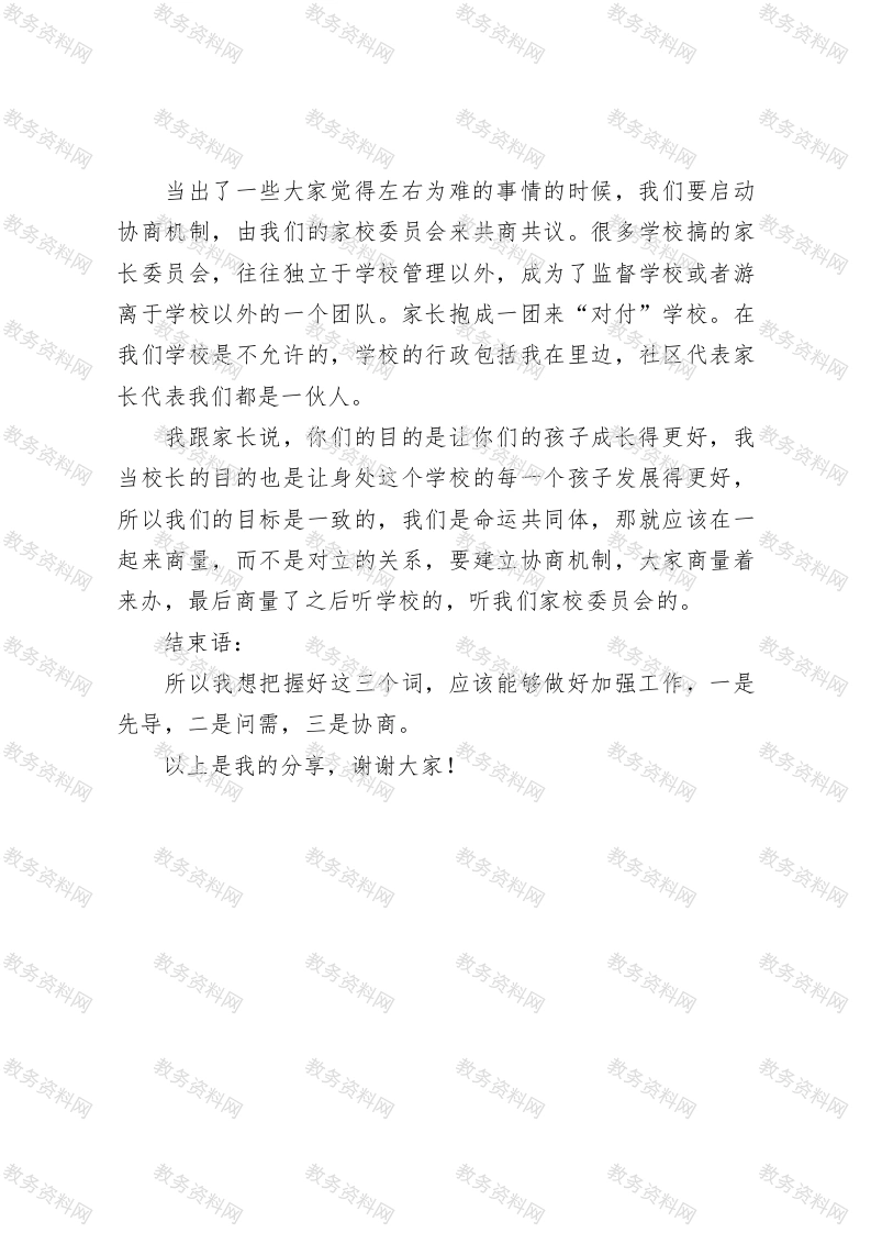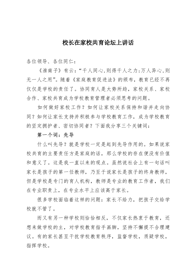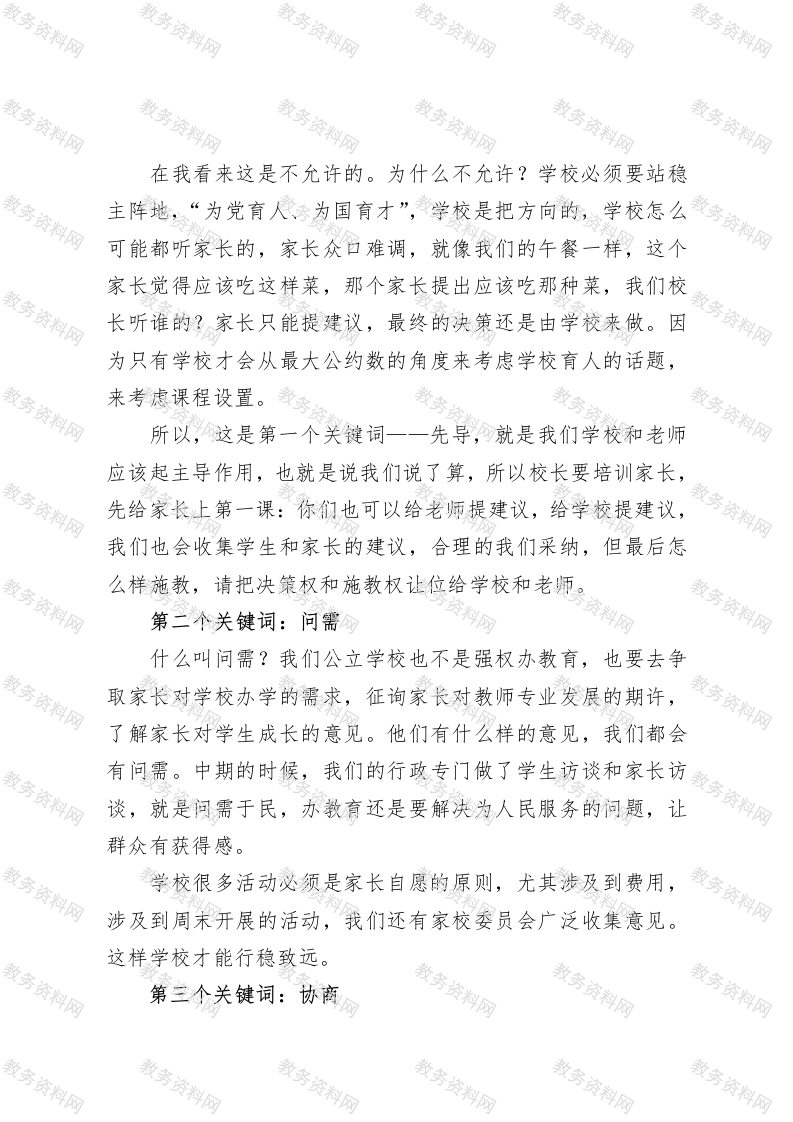 校长在家校共育论坛上讲话各位领导、各位同仁:《准南子》有云:“千人同心,则得千人之力;万人异心,则无一人之用”。随着《家庭教育促进法》的颁布,教育已经不再仅仅是学校的责任了。协同育人是大势所趋,家校关系、家校合作、家校共育成为学校教育管理者必须思考的问题。如何做好家校工作?如何让家校关系保持和谐并走向协同?如何让家长支持并积极参与学校教育工作,成为学校教育的坚定拥护者、密切协同者?下面我分享三个关键词:第一个词:先导什么叫先导?就是学校一定是起到先导作用的。如果说家校共育的主要责任方是家庭的话,那么学校的存在便没有价值和意义了。这是我一直以来的观点。虽然说社会上有一句话叫家长是孩子的第一任教师,乃至于说家长是孩子的终身教师,但是学校是专门的育人机构,教师是专业的教育工作者,我们在专业职责上,在专业水平上应该高于家长。很多学校面临着这样的问题:家长不给力,把孩子交给学校就不管了。而又有另一种学校则恰恰相反,不仅家长热衷于教育,还想来做学校的主,对学校教育指手画脚,坚持不懈提不合理建议。有的家长甚至干扰学校教育秩序,监督学校,质疑学校,指挥学校。