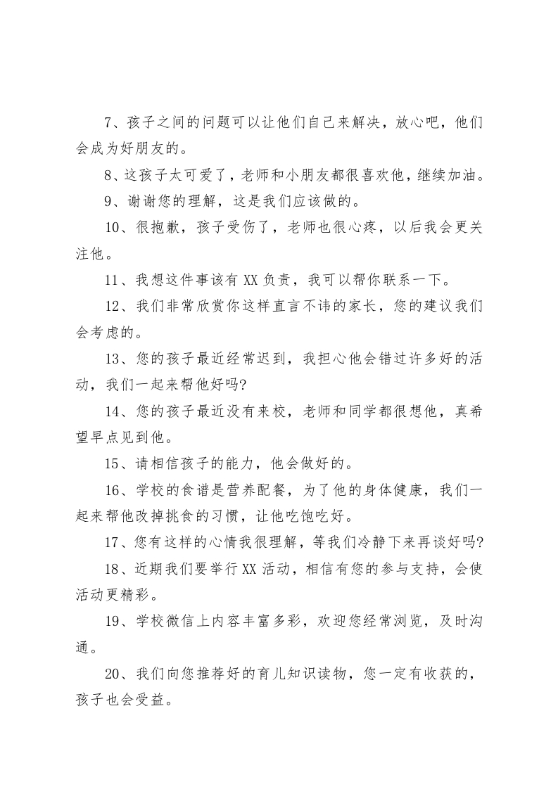 校长在教师会议上讲话,主要讲了老师与家长的沟通技巧,最后送给教师20句经常可以说的话老师们:今天我们召开教师例会,本次会议的主题是围绕我们老师与家长沟通技巧的方面。每个家长都希望自己孩子有出息,所以必然都希望得到对孩子的表扬。首先,在家长开口之前,我们就要夸夸孩子的亮点,学习不好夸态度,态度不好夸聪明,资质差夸听话,反正调好听的话夸;然后,我们要针对家长的态度,进一步夸到家长身上去,表扬家长的教育和素养;最后,再委婉地指出孩子的问题,让家长也引起重视。那么如何有效与家长沟通,我认为我们老师应该至少掌握以下4个技巧。一、尊重家长是前提家长和教师的交流是一种平等的交流,不存在贵贱之分,特别对待那些调皮孩子的家长,更要悉心交流,多从教师自身找原因,站在公正公平的角度来分析问题的症结所在,与家长共商解决问题的对策,切莫当众指责家长,甚至侮辱家长,这样不仅不能解决问题,还可能激发更大的矛盾,记住,尊重家长就是尊重自己。二、懂得倾听是手段与家长交流,要懂得倾听,不能以“教育权威”自居,一