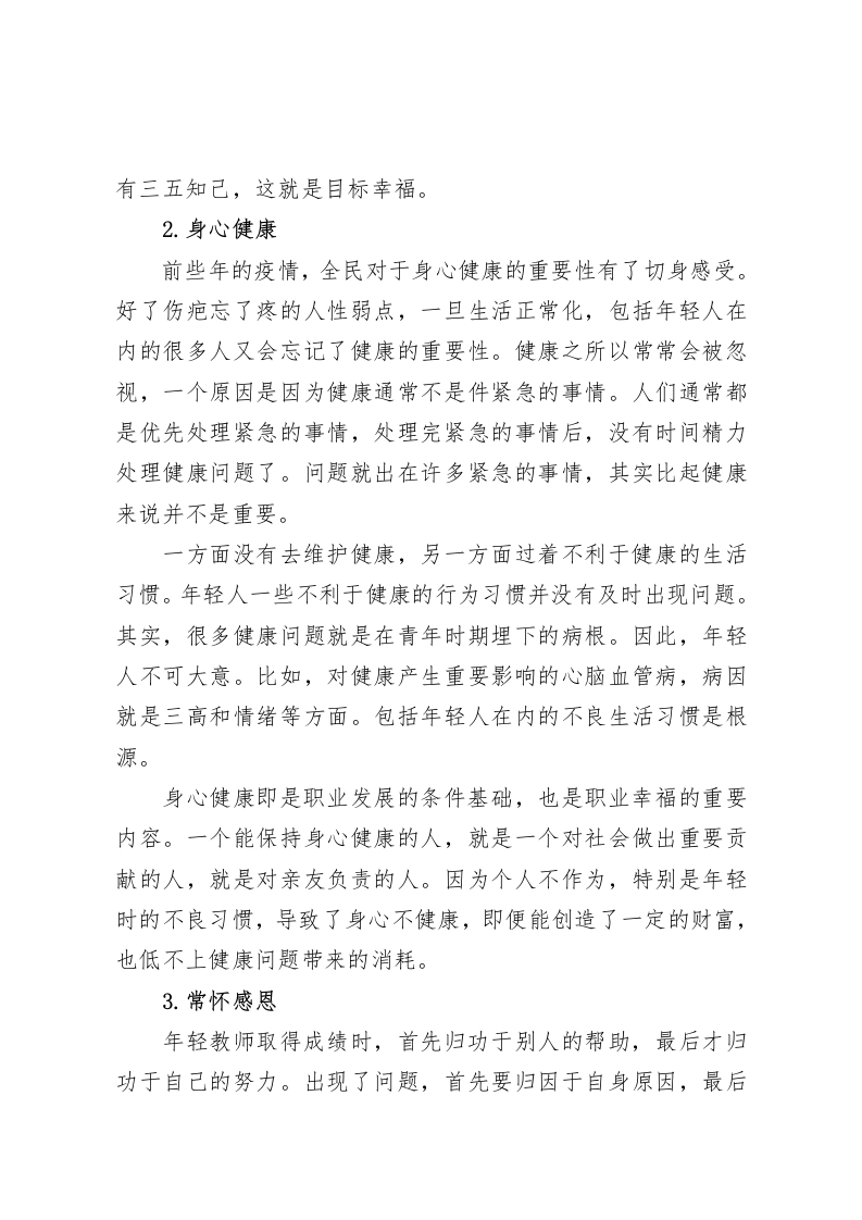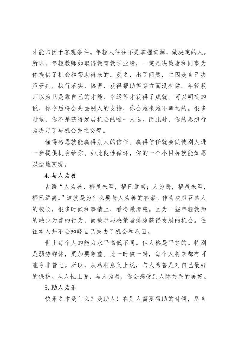 校长在教师会议上讲话,主要谈了青年教师生涯规划的10条建议各位老师:大家好!我校教师队伍又新增了青年教师,已成为学校教育教学工作的重要力量。机会总是青睐那些有准备的人。在此我想给在座的青年教师职业生涯规划提出下列十条建议,供参考。如能领悟,或可助力各位青年教师快速成长成为同辈的佼佼者。1.目标幸福职业生涯目标是否科学准确事关青年教师的一生一世。很多人之所以暮年悔意深重,根源在于年轻时确立的职业生涯目标不精准正确引发的。科学准确的职业生涯目标应该是什么?应当是把“做一个幸福的普通人”作为职业生涯规划核心目标,而非富贵之人。所谓“幸福”就是基于每个人的现实条件而制定的可实现的人生目标。幸福人人可获得,成功只属于少数人。非富即贵是社会主流的人生目标。这没有错,但对于教师职业来说不精准。富贵终究属于少数人,而更多的人一生只是凡夫俗子。这不是消极之思想,而是清醒的认识。有了这样基于现实的职业生涯目标,就不会好高骛远,甚至铤而走险。年轻教师如能一生安静的教书育人,享受人世间的天伦之乐,身心健康,有爱好,