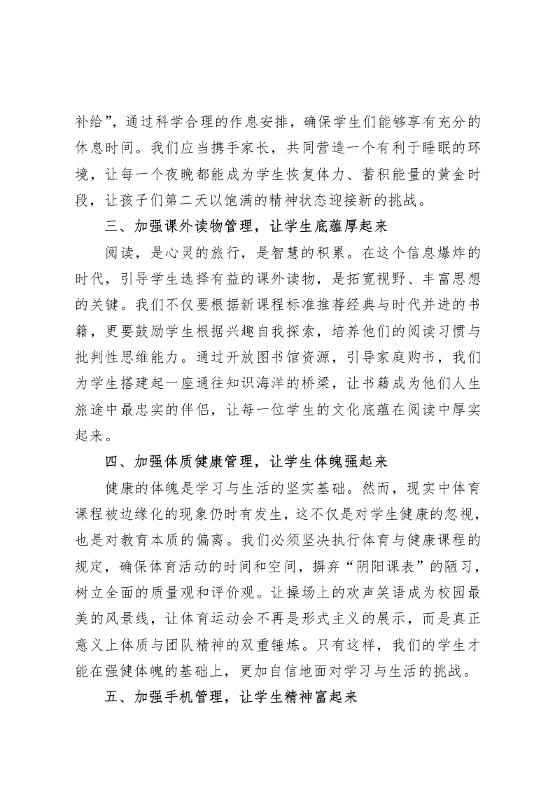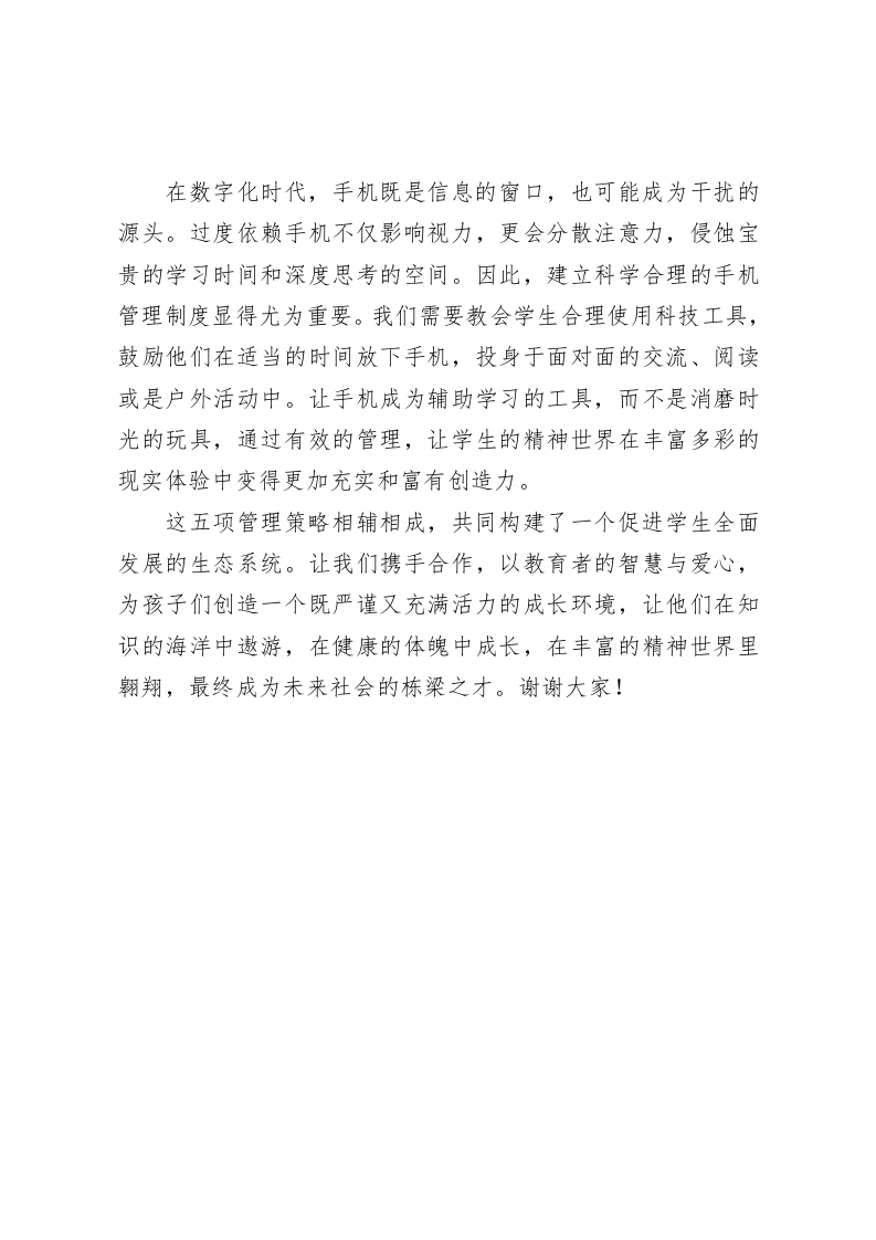 校长在教师会议上讲话五项管理助成长尊敬的各位领导,亲爱的同事们:大家好!今天,我非常荣幸能在此与大家分享关于教育中的五项关键管理策略,它们不仅关乎我们学生的学业成就,更直接影响到他们的全面发展与健康成长。让我们共同探讨如何通过加强作业管理、睡眠管理、课外读物管理、体质健康管理以及手机管理,为孩子们铺设一条通向更加辉煌未来的道路!一、加强作业管理,让学习任务精起来作业,作为教学与学习之间的桥梁,其重要性不言而喻。它不仅是知识巩固的工具,更是技能形成的平台。我们需精心设计每一项作业,使之成为学生探索未知的航标,而非机械重复的负担。作业应当是精炼的,能够激发学生的好奇心,促使他们在思考中深化理解,在实践中磨练技能。教师们,让我们共同努力,通过作业管理的精细化,让每一份作业都成为点燃智慧火花的火种,让学习任务真正精起来,让孩子们在挑战中享受成长的乐趣。二、加强睡眠管理,让学生元气足起来在快节奏的学习生活中,充足的睡眠犹如滋养身心的甘露。科学研究早已证明,良好的睡眠质量是保证学生高效学习与健康成长的基石。然而,令人担忧的是,许多学生正面临着睡眠不足的困境。作为教育者,我们有责任守护这份宝贵的“自然