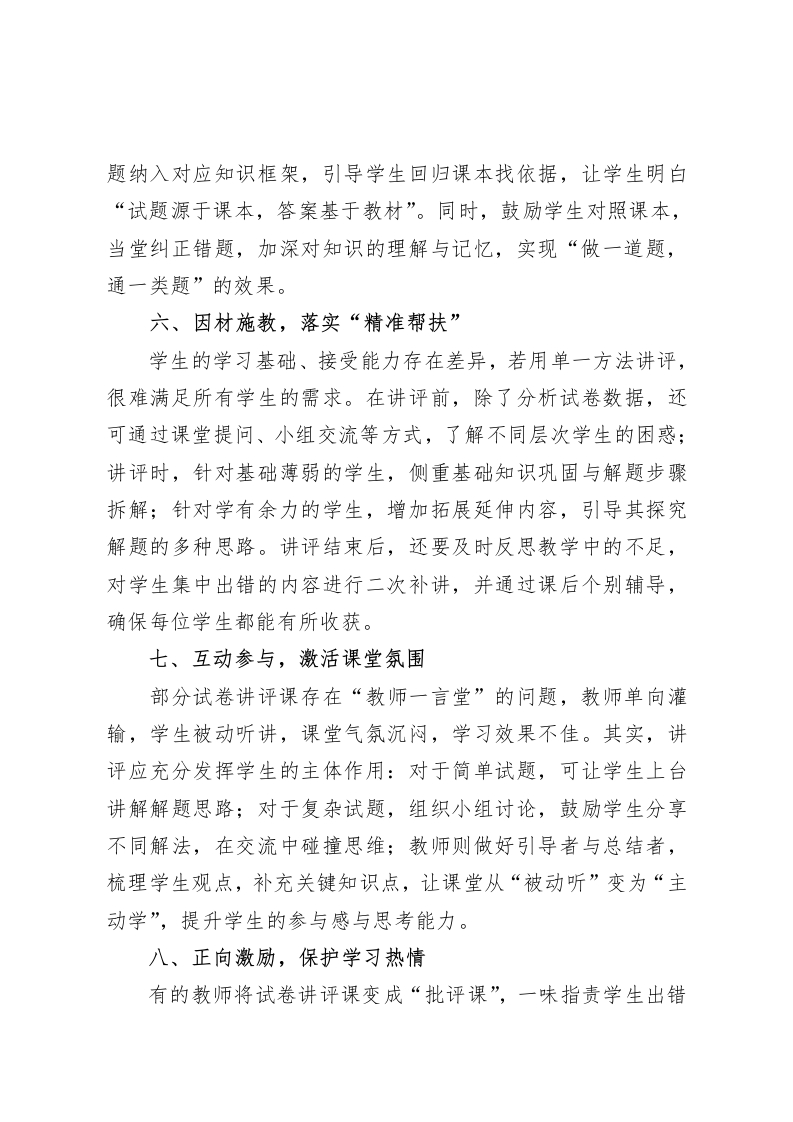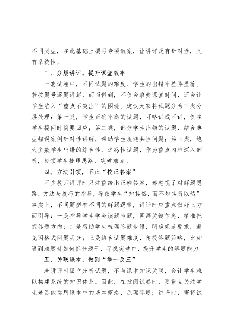 校长在期中教师会议上讲话如何上好试卷讲评课各位老师:期中考试已落下帷幕,半个学期的教学工作进入复盘阶段。近期我注意到,大家都在紧锣密鼓地分析学生成绩,但在试卷讲评课这一关键环节,部分教师仍存在重视不足、研究不深的问题,导致课堂效果未达预期,难以真正帮助学生查漏补缺、提升能力。今天,我们就围绕“如何上好试卷讲评课”展开交流,我梳理了9个核心要点,希望能为大家提供切实参考,不足之处也请各位批评指正。一、抢抓时效,实现“趁热打铁”测试结束后,学生对试题记忆清晰、求知欲旺盛,这是讲评的黄金窗口期。若阅卷拖沓、分析滞后,等学生对试题印象淡化、学习热情消退后再讲评,效果会大打折扣。因此,建议各位教师在测试结束后,尽快完成阅卷工作,同步做好数据统计与学情分析,抓住学生的“求知敏感期”及时开展讲评,让课堂效果事半功倍。二、精准备课,杜绝“无的放矢”部分教师将试卷讲评课视为“简单对答案”,课前不做准备,课堂上信口开河、想到哪儿讲到哪儿,既无法聚焦学生问题,也难以让学生真正理解。实际上,试卷讲评课的备课工作应从阅卷时就开始:记录学生答题情况,区分“高频错题”与“个别错题”,明确“知识性失分”“技巧性失分”“粗心性失分”等