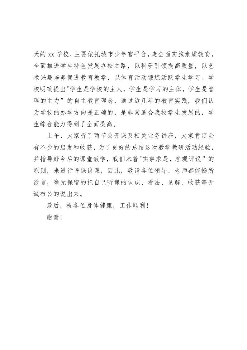 校长在学校联合教研活动中致辞尊敬的各位领导、老师、大家下午好!在这花果飘香的美好季节里,我们xx学校及xx学校近100名老师相约这里,开展教学研究活动。首先,我代表Xx学校全体师生向各位领导、老师亲临我校指导工作表示热烈的欢迎!并对为我们提供交流平台上公开课的两位老师表示衷心的感谢!为了进一步推进教育教学的开展,深化校本教研,引领教师专业成长,构建高效课堂,提高校本教研质量,促进各校教学教研工作的均衡发展,实现区域内教育教学的交流与共享,今天,我们相聚在这里,目的就只有一个“共同进步,共同提高”。xx学校从事课题研究应该起源于上世纪八十年代末期,那时的“注音识字、提前读写与现代小学数学同步实验"课题,经过四年实验研究,该课题获省科技成果二等奖,得到了省、市教育专家的高度认可,学生学习受益匪浅。近年来,课题《小学数学“情境与问题”探究》获省级科技成果三等奖;已经获得结题的省级课题有《小学科学探究活动与习作教学有效结合实验研究》和《城乡小学结对帮扶模式探究》:还有国家级课题《利用信息技术创设情境与效果评价研究》和省级课题《小学语文略读课文课堂教学模式及策略实践研究》正在探究之中。一路走来,xx学校已经形成科研兴校,科研强教的良好发展道路。今