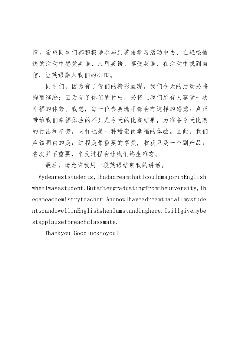 校长在英语演讲比赛上讲话过程是最重要的享受,收获只是一个副产品老师们、同学们:大家好!今天,我们欢聚一堂,举行英语故事演讲比赛。首先,我谨代表学校对精心策划本次比赛付出辛勤劳动的老师们表示衷心的感谢,对入围决赛的选手表示祝贺,对前来参观指导的领导和兄弟学校的老师们表示热烈的欢迎!英语,作为一种世界通用的交际工具,在人们的生活、学习、工作中具有非常重要的作用。具备扎实的英语功底,熟练地应用英语,是时代对当代学生的召唤。为丰富同学们的校园文化生活,拓展我校英语教学的第二课堂,展示我校师生学英语、用英语的风采,进一步营造浓厚的英语氛围,我们举行了本次英语故事演讲比赛。我希望通过这次比赛,为我们的同学提供一个施展自我的平台,也为提高自身英语素质创设一个良好的氛围。希望各位参赛选手,能以高超的英语素养展现出自己的才华,以出色的演讲技巧展现自己的潜能,以娴熟的临场发挥展现自己的睿智,以得体端庄的举止展现自己的品位。我相信,这次比赛将是全体同学英语学习水平和学习成效的一次精彩展出,它一定会对我们的校园文化产生重大影响,也将极大的推动我校英语教学发展,激发同学们学习英语的热
