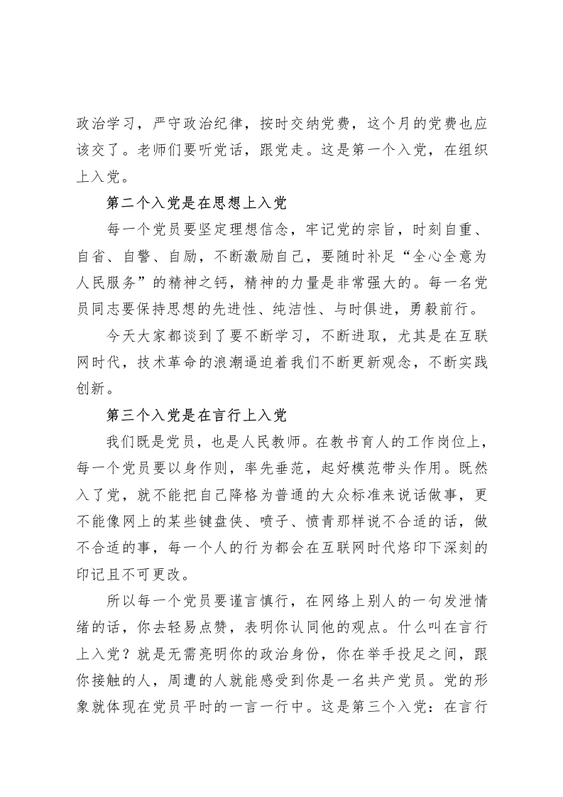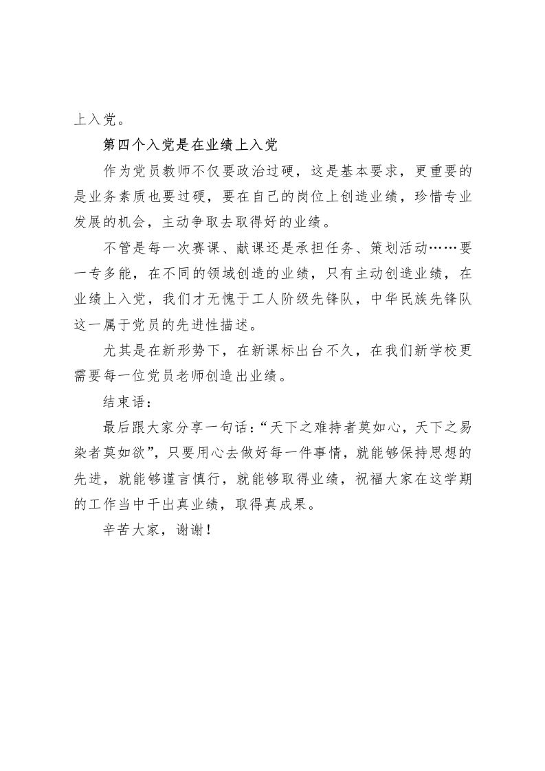 校长在预备党员转正大会讲话各位党员同志:大家好!今天我们支部又有几位同志正式成为中国共产党党员。刚才几位党员在表态发言中都谈到感到无比光荣和自豪,他们感谢党组织在预备期对他们的关怀,感谢各位党员同志对他们的关心和帮助。他们纷纷表示将一如既往的加强学习,努力工作,用一名合格共产党员的标准来严格要求自己,再次感谢大家。希望你们认真遵守党的纪律和各项规章制度,认真履行党章规定的各项党员义务,注重党员形象,坚定共产主义理想和信念,对党的事业忠诚执着,始终不忘自己的党员身份,吃苦在前,享受在后,发挥先锋模范作用,以大局为重,团结同志,奋发向上。今天是一个非常光荣的时刻,通过了这次会议就标志着这几位同志的政治生命有了新的开端,人生上了新的台阶,有了一个新的出发点。作为学校支部书记,对几位同志正式转正表示衷心的祝贺。再一次把掌声送给二位。接下来我想提4点希望,这4点希望既是对正式转正的党员同志提的,也是给在座的包括我自己提的,这4个希望是“4个入党”:第一个希望是在组织上入党既然我们都是中共正式党员,那么在组织上就要服从党组织的领导,积极参加党组织的活动,认真履行党员义务,加强