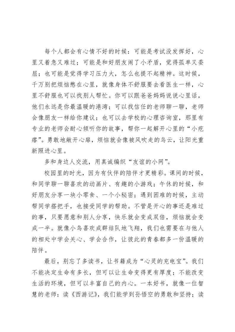 心理健康教育,校长国旗下讲话:呵护阳光心灵,绽放青春光彩尊敬的老师们,亲爱的同学们:同学们,生命就像一颗独一无二的种子,从生根发芽到开花结果,每一个阶段都充满了无限可能。而我们正处在人生中最珍贵的青春时光,这不仅是身体快速成长的阶段,更是心灵逐渐丰盈、心智走向成熟的关键时期。校园里,你们的笑声像清脆的风铃,你们奔跑的身影像灵动的音符,正是这些鲜活的瞬间,让我们的校园充满了活力与温暖。也正是因为有了生命的存在,我们才能在课堂上探索知识的奥秘,在操场上挥洒运动的汗水,在与伙伴的相处中收获真挚的友谊,一步步去追逐属于自己的梦想。想要守护好这段宝贵的青春,呵护好我们的心灵,其实并不难,只要记住这几个小方法:主动学习心理健康知识,做自己心灵的“小管家”。就像我们每天要学习语文、数学知识一样,心理健康知识也能帮我们更好地了解自己。大家可以去图书馆借一本关于心理成长的绘本,比如《我的情绪小怪兽》,看看不同的情绪像什么颜色的小球;也可以认真听一听学校组织的心理健康讲座,记住那些调节心情的小技巧;还可以积极参加校园里的心理社团活动,在游戏和互动中学会认识自己、理解他人。遇到烦恼别慌张,勇敢寻求帮助是“大智慧”。