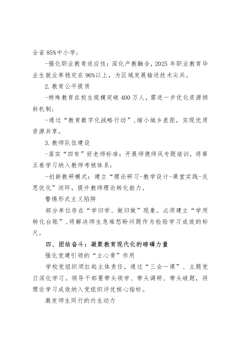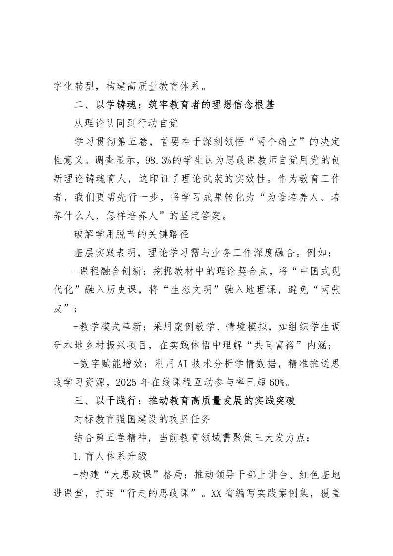 在XX学校学习《习近平谈治国理政》第五卷专题党课上的讲稿(精品)同志们:今天,我们齐聚一堂,共同深入学习《习近平谈治国理政》第五卷这一闪耀着马克思主义真理光芒的纲领性文献。此卷收录了习近平总书记自2022年5月27日至2024年12月20日期间的91篇重要著作,以18个专题系统阐释了新时代治国理政的崭新篇章,是习近平新时代中国特色社会主义思想的最新理论结晶,更是我们教育工作者投身教育强国建设的根本遵循。一、深刻领悟第五卷的时代价值与核心要义理论创新的时代坐标第五卷的出版恰逢全面建设社会主义现代化国家的关键阶段。其核心聚焦于中国式现代化的顶层设计、高质量发展的实践路径、新质生产力的战略部署以及全球治理的中国方案。这些论述深刻回答了“世界之变、时代之变、历史之变”下的中国发展命题,彰显了理论与实践的高度统一。教育强国的思想灯塔习近平总书记指出:“教育是国之大计、党之大计。”第五卷将“实施科教兴国战略”独立成章,强调教育必须“坚持为党育人、为国育才”。2025年《教育强国建设规划纲要》的出台,正是将这一思想转化为行动纲领的标志。纲要明确要求以习近平新时代中国特色社会主义思想铸魂育人,推动教育数