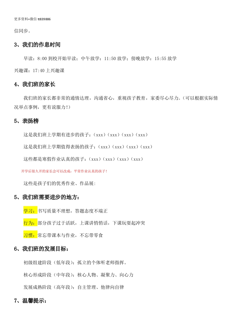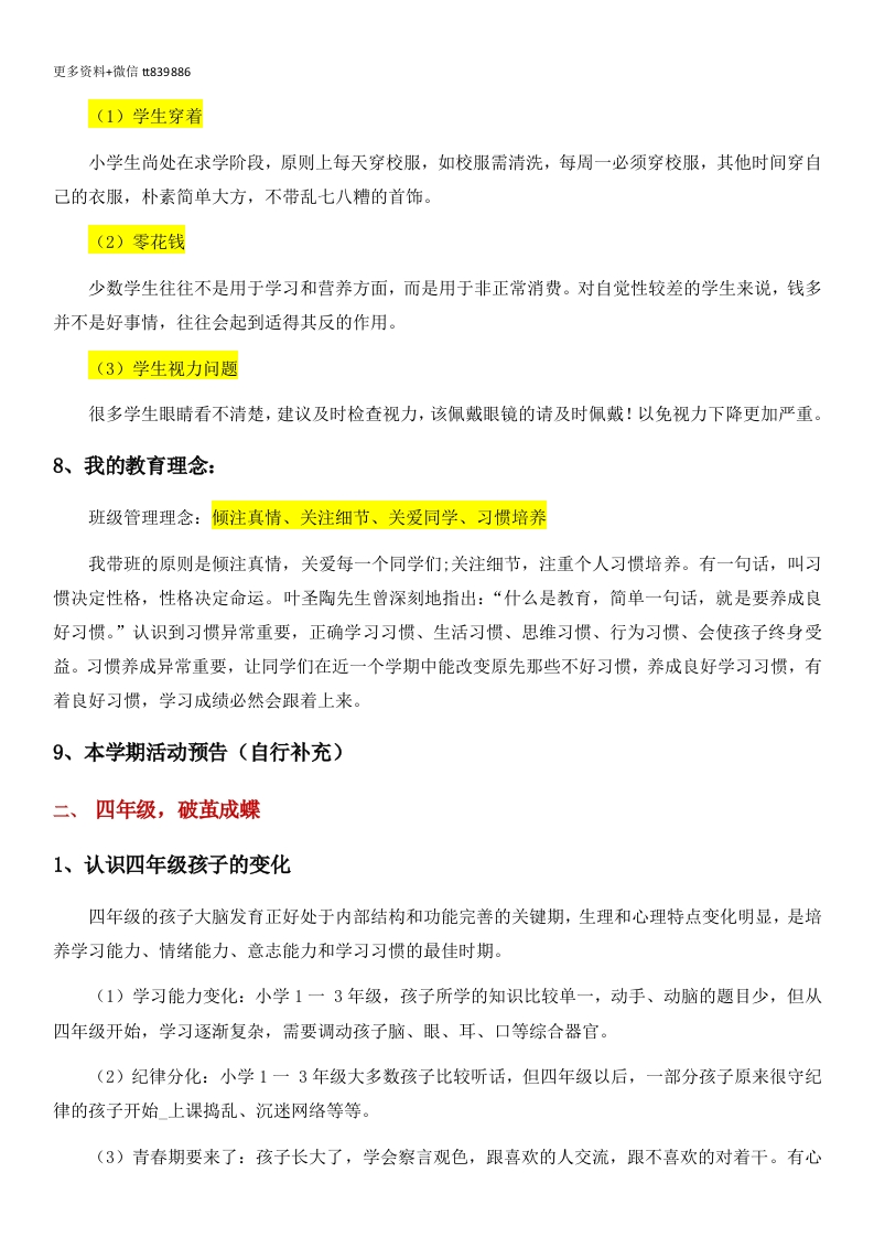 更多资料+微信t839886携手同行守望成长让我们一起,做助力孩子成长的风帆!班主任:时间:202x年春四(4)班家长会前言、目录各位家长:晚上好!首先感谢大家在百忙之中抽出时间来参加今天的家长会,同时也感谢大家长期以来对我们学校工作的大力支持和帮助。今天有这样的机会坐在一起,是为了一个共同的目的,为了孩子的成长与发展。上一学期成绩已经成为过去,我们要重结果,更要重视过程,我们一起向未来!本次家长会分为4个板块进行:展望四年级:四年级,破茧成蝶:四年级,不能没有你:安全教育牢记心中。一、展望四年级1、我们的孩子我们班男生22人女生19人,全班共计41位同学。我们班的状况学习情况:他们已掌握了一定的学科基础知识,思维能力也在提升。部分学生感到压力增大。同时,学习态度、习惯以及自主学习能力也在逐步培养中,同伴关系和社交环境对学习产生着显著影响。行为方面:展现出更多的独立性和责任感,能够自觉遵守规则并积极参与集体活动。然而,仍有部分孩子在自我控制和情绪管理方面需要提升。此外,同伴关系对他们的影响逐渐增强,良好的社交技能变得愈发重要。习惯方面:开始形成良好的学习习惯,如定时复习、独立完成作业和自觉预习等,同时也在培养日常生活习惯,如规律作息和健康饮食。然而,仍有一些孩子存在拖延、粗心等不良习惯。2、我们的老师这是我们班的语文老师,(简单介绍一下)。这个是我们班的数学老师(简单介绍一下)这是我们班的英语老师,(简单介绍一下)。下面有各科老师的联系方式,有需要的家长可以存下,手机号与微