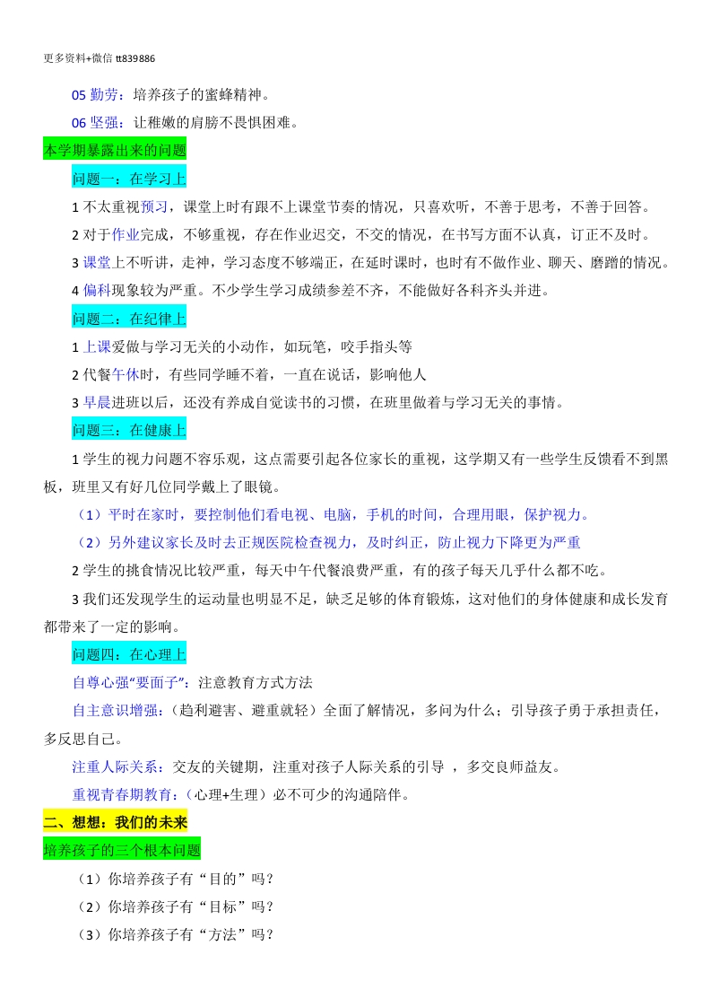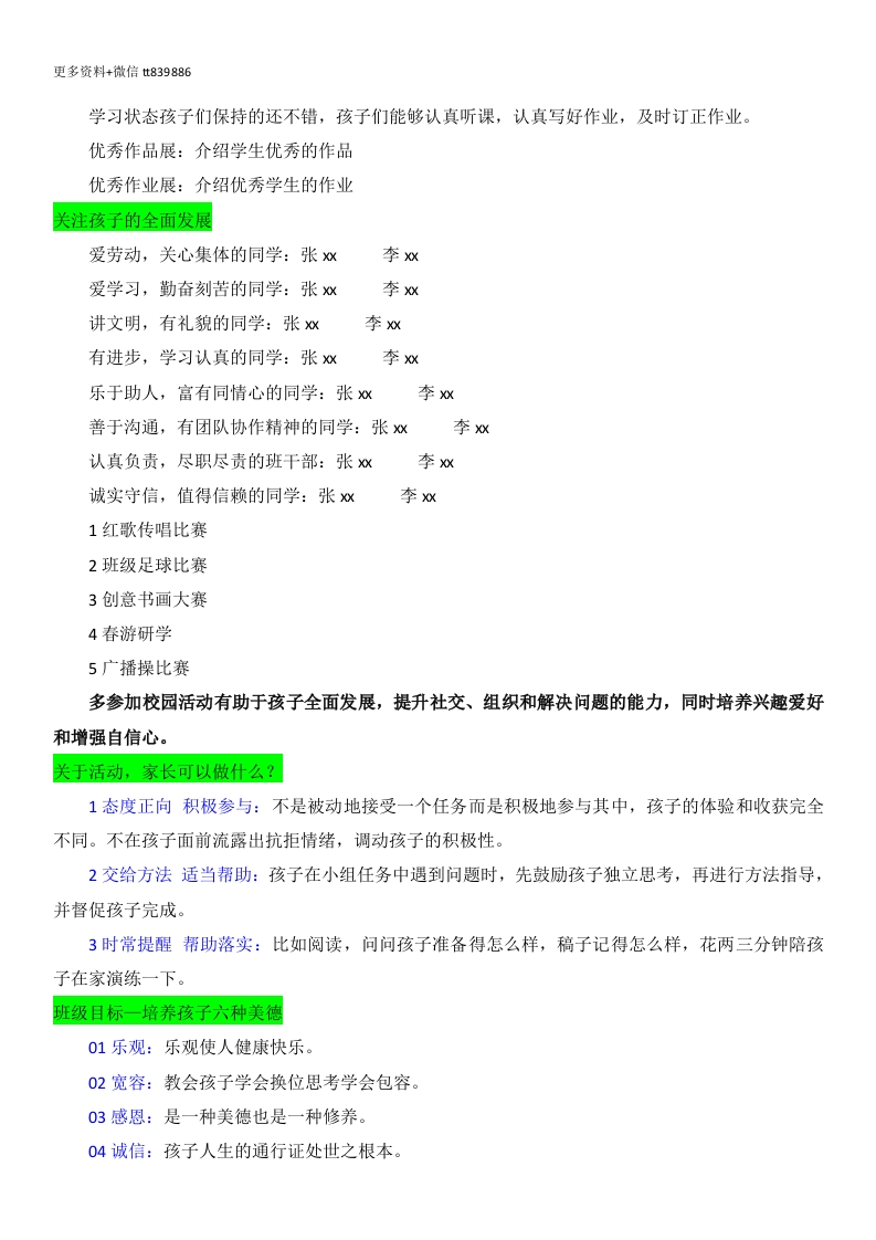 更多资料+微信t839886【四下】【语文】【清晰现状明确方向】期末家长会发言稿前言:新时代教育环境多变,孩子成长路径复杂。家长需清晰把握孩子现状,以更好地引领他们前行。在了解孩子们的现状之后,我们将共同探讨如何为他们规划一个更加明确、有针对性的教育方向。我们相信,只有明确了方向,孩子们才能在学习的道路上更加坚定、从容地前行。在此,我们期待与各位家长携手合作,共同为孩子们的成长保驾护航。目录:01谈谈:我们的现状02想想:我们的未来03看看:四升五变化04聊聊:我们的暑假“、谈谈:我们的现状平常想了解孩子的在校情况?怎样了解孩子在学校的学习状态?“三看”1.从各科作业上看。(翻开孩子的练习本、课本,亲自走进孩子的点滴生活中)2.从做题规范上看。(学生应认真审题,确保答案与题目要求相匹配:同时,注意书写规范,保持卷面整洁,以提高答题质量和得分率。)3.从单元小测成绩看。(最为客观,及时查漏补缺)比你发微信问老师孩子最近表现怎么样更有效四二班这个大家庭我们班男生20人,女生18人,总人数38人。到了这个学期,明显感觉他们长大了许多,大多数学生懂事,听话,在个人良好习惯养成方面取得了很大的进步,班上同学团结友爱,互帮互助。开学以来,我采取了小组合作式的学习方式,彼此帮忙帮助,一起成长。总结孩子的几点:善良、可爱:热情,关心班集体:内心活动很丰富:乐于挑战:他们正在进步我们在进步班级纪律方面班级纪律方面有很大进步,很多同学自我约束能力较强,自觉遵守各项纪律。生活方面生活自理能力方面,很多小朋友可以学会自己清洗自己的衣物。学习状态方面