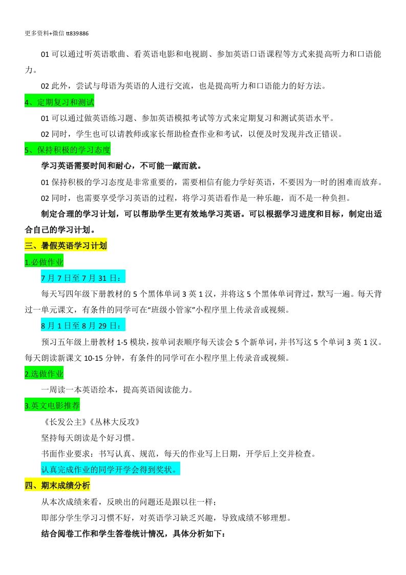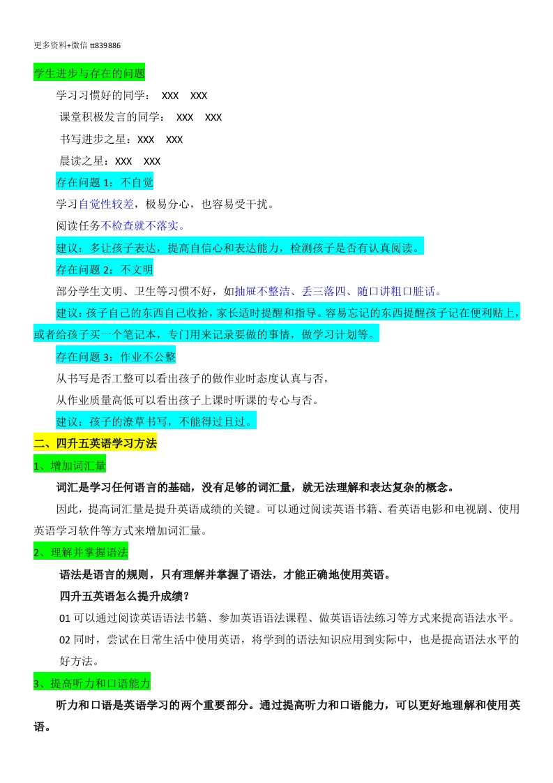 更多资料+微信t839886【四下】【英语】【读懂孩子用心陪伴】期末家长会发言稿目录:01本学期回顾总结02四升五英语学习方法03暑假英语学习计划04期末成绩分析05让孩子在快乐中学习06暑假安全注意事项本学期回顾总结(1)学习习惯1、读书姿势:两手拿书、斜放桌面。2、写字姿势:眼里书本一尺,胸离桌子一拳,手离笔尖一寸。3、坐端姿势:身正、肩平、腰挺、足安。4、作业完成:保时、保质、保量完成。5、上课前:课前预习、课前准备(书本、铅笔、橡皮)左上角。6、上课中:坐姿端正、认真听讲、积极回答问题,不乱说话。7、下课后:整理用具、摆放桌椅、捡拾垃圾:课后复习巩固。8、在家学习习惯,如写作业前的准备,写完后整理,在家学习营造的氛围感。(2)英语书写习惯1.使用规范的英语手写体:学生应该学习并使用规范的英语手写体进行书写,确保字母的形状、大小写和间距都符合标准。2.保持卷面整洁:书写时要保持纸张整洁,避免涂改和乱涂乱画。如果写错了,可以轻轻划掉,但不要大面积涂黑或使用涂改液:3注意字母的笔顺和占格:每个字母的书写都应遵循正确的笔顺,并且要注意在四线三格中的占位,确保字母大小适中,不超出格子。4.正确使用标点符号:句子结束时使用句号(.),问句结束时使用问号(?),感叹句结束时使用感叹号(!)。同时,也要学会在句子中正确使用逗号(,)来分隔不同的部分。(3)仪容仪表穿校服、佩戴红领巾、男生头发前不盖眉后不盖耳:不留长指甲:女生不佩戴耳饰、头饰、手链等饰品:保持手、脸、服装干净整洁