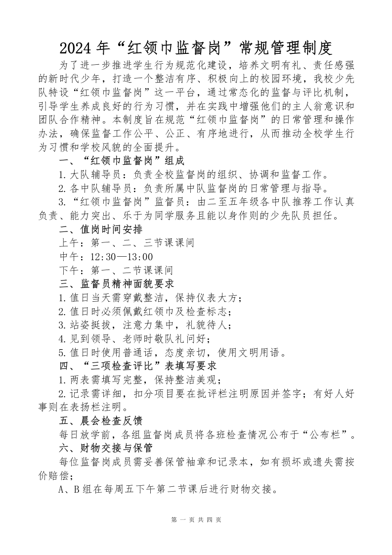 2024年“红领巾监督岗”常规管理制度为了进一步推进学生行为规范化建设,培养文明有礼、责任感强的新时代少年,打造一个整洁有序、积极向上的校园环境,我校少先队特设“红领巾监督岗”这一平台,通过常态化的监督与评比机制,引导学生养成良好的行为习惯,并在实践中增强他们的主人翁意识和团队合作精神。本制度旨在规范“红领巾监督岗”的日常管理和操作办法,确保监督工作公平、公正、有序地进行,从而推动全校学生行为习惯和学校风貌的全面提升。一、“红领巾监督岗”组成1.大队辅导员:负责全校监督岗的组织、协调和监督工作。2.各中队辅导员:负责所属中队监督岗的日常管理与指导。3.“红领巾监督岗”监督员:由二至五年级各中队推荐工作认真负责、能力突出、乐于为同学服务且能以身作则的少先队员担任。二、值岗时间安排上午:第一、二、三节课课间中午:12:30-13:00下午:第一、二节课课间三、监督员精神面貌要求1.值日当天需穿戴整洁,保持仪表大方;2.值日时必须佩戴红领巾及检查标志;3.站姿挺拔,注意力集中,礼貌待人:4.见到领导、老师时敬队礼问好;5.值日时使用普通话,态度亲切,使用文明用语。四、“三项检查评比”表填写要求1.两表需填写完整,保持整洁美观;2.记录需详细,扣分项目要在批评栏注明原因并签字;有好人好事则在表扬栏注明。五、晨会检查反馈每日放学前,各组监督岗成员将各班检查情况公布于“公布栏”。六、财物交接与保管每位监督岗成员需妥善保管袖章和记录本,如有损坏或遗失需按价赔偿;A、B组在每周五下午第二节课后进行财物交接。第一页共四页