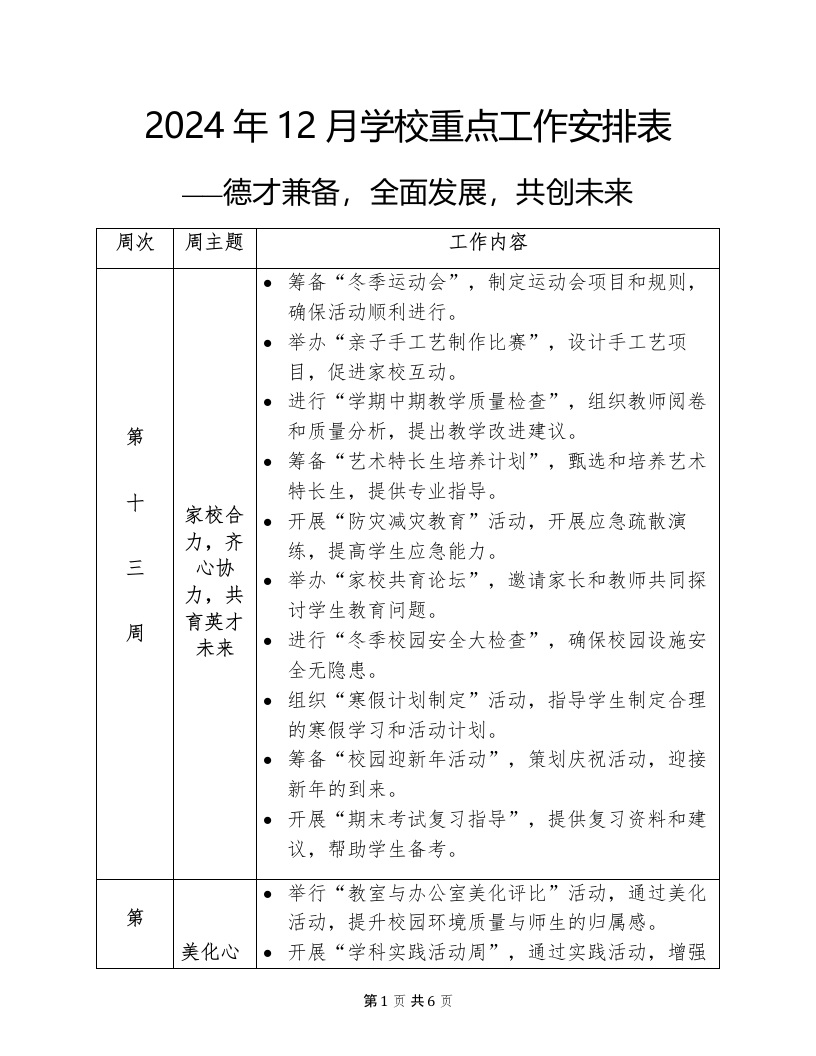 2024年12月学校重点工作安排表德才兼备,全面发展,共创未来周次周主题工作内容筹备“冬季运动会”,制定运动会项目和规则,确保活动顺利进行。举办“亲子手工艺制作比赛”,设计手工艺项目,促进家校互动。·进行“学期中期教学质量检查”,组织教师阅卷第和质量分析,提出教学改进建议。筹备“艺术特长生培养计划”,甄选和培养艺术十特长生,提供专业指导。家校合·开展“防灾减灾教育”活动,开展应急疏散演力,齐练,提高学生应急能力。三心协举办“家校共育论坛”,邀请家长和教师共同探力,共讨学生教育问题。周育英才未来0进行“冬季校园安全大检查”,确保校园设施安全无隐患。·组织“寒假计划制定”活动,指导学生制定合理的寒假学习和活动计划。筹备“校园迎新年活动”,策划庆祝活动,迎接新年的到来。开展“期末考试复习指导”,提供复习资料和建议,帮助学生备考。·举行“教室与办公室美化评比”活动,通过美化第活动,提升校园环境质量与师生的归属感。美化心开展“学科实践活动周”,通过实践活动,增强第1页共6页