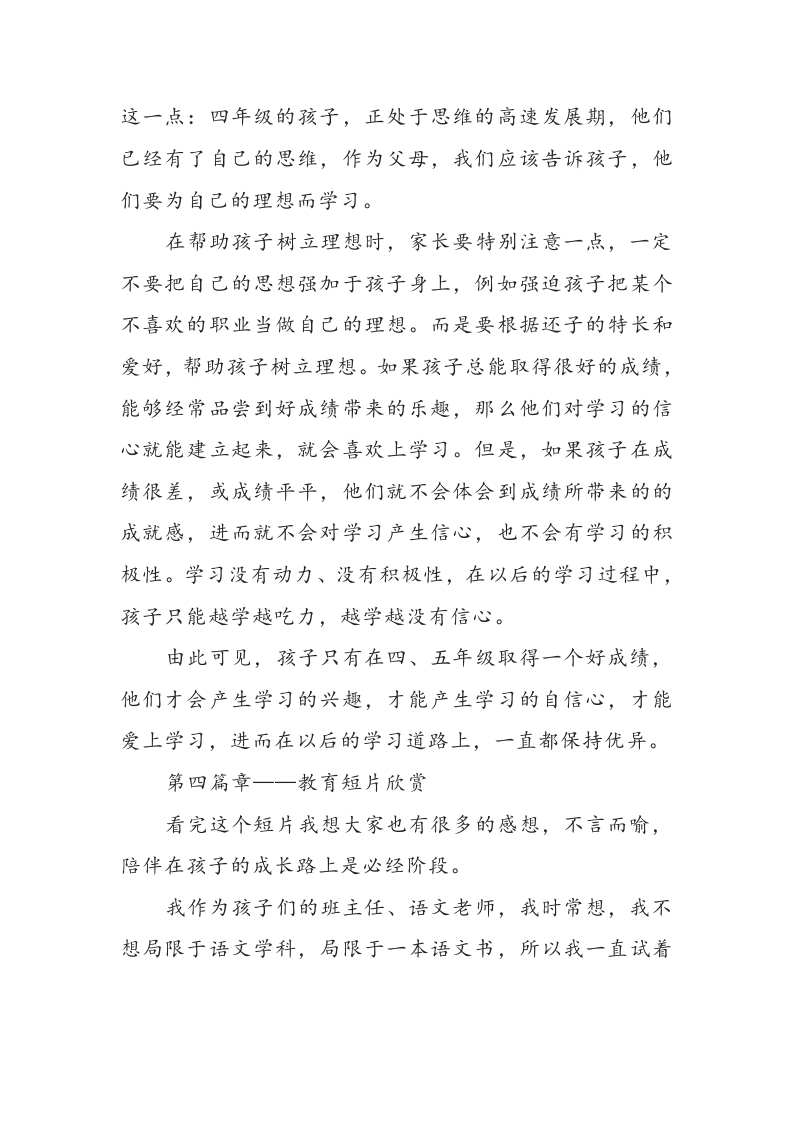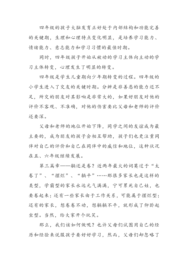 共沐风雨静待花开家长会发言稿各位家长:大家好!欢迎准时来参加今天的家长会。我非常高兴,我们又在这春暖花开的时节见面了。也如我今日家长会的题目:共沐风雨静待花开新一年,心相见。首先我先感谢各位家长,没有您的配合,学生不会有今天的飞速进步!放学以及节假期间,是你们一直陪在孩子身后,不厌其烦的鼓励他们,克服种种困难,您的负责、认真,是对孩子最好的教育!本次家长会分为五个篇章…第一篇章一一点赞闪闪发光的时刻在学校里的日子总是闪亮的,下面我们一起来看看在校园里的精彩瞬间吧!第二篇章一一破茧成蝶的四年级,我非常喜欢这个词,破茧成蝶,因为它正适合我们四年级的孩子们。我们都知道,蝴蝶要破茧而出,那必须是自己冲破束缚的茧出来,若有外力帮助,那必死无疑!我们即将完成四年级的学业,升入五年级进入更为重要的学习阶段,正如这即将破茧重生的蝴蝶!想翩翩起舞,那定是靠自己的艰辛努力!