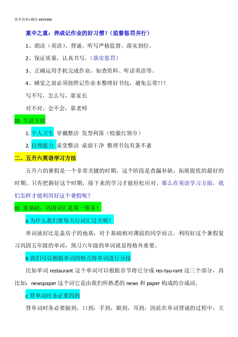 更多资料+微信t839886【五下】【英语】【心向往之行必能至】期末家长会发言稿目录:01本学期回顾总结02五升六英语学习方法03暑假英语学习计划04期末成绩分析05谈谈家长的苦恼06暑假安全注意事项本学期回顾总结五年级现象?坏习惯?成绩下滑?不爱学习?爱顶嘴?01【外因】文化课学习的难度变大了·二三年级的时候,孩子们只需要做到认识和记住,就可以得到不错的成绩。进入五年级,孩子们会真正地开始学习文化知识,语文阅读量变多了,难度也增加了,而且学习内容变多了,对思考的要求更高了。“教育的本质,就是培养习惯。”02【内因】五年级成绩滑坡,滑的是成绩,缺的是习惯。五年级滑坡的往往是孩子的习惯出了问题,他们大多没有良好的书写习惯,不爱阅读,不喜欢举手,不会倾听,更不愿动笔写日记.…。目前班级存在的问题1、说脏话、说谎话、上课说废话、爱竖中指、爱顶嘴2、课堂参与度不高3、家庭作业质量不高