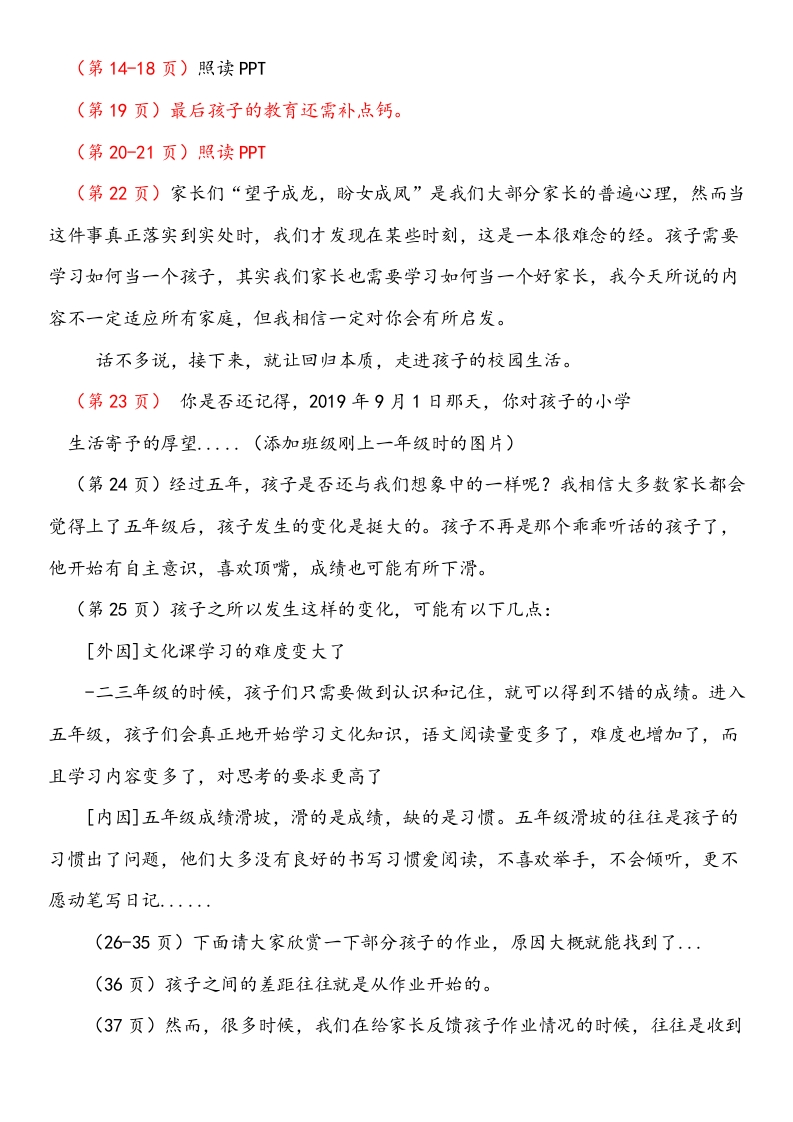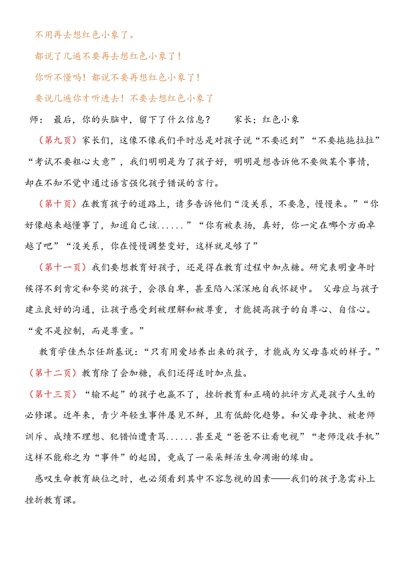 先放糖,后放盐,再补钙(第一页)各位家长大家下午好,首先非常感谢各位家长从百忙中抽时间出来赴这场“春日之约”。希望和家长们一起聚焦当下,蓄能未来。今天,我们家长会的主题是“先放糖,后放盐,再补钙”。(第二页)清华附小校长窦桂梅说:“最好的家庭教育,是先放糖,后放盐,再补钙。”糖,是给孩子关爱与鼓励:盐,是教会孩子直面挫折;钙,是让孩子学会自强自立。其实啊,我们教育就像做菜一样,想要把一道菜做得好吃,缺一样调味料都是不可以的。著名校长李镇西曾说:“学校教育非常重要,但无论多么重要,都只是家庭教育的重要补充。”父母是孩子最好的老师,家庭教育更是孩子一生的起跑线。(第三页)所以我今天就把家庭教育放在了第一部分内容,希望各位家长能从中有所感悟。(第四页)心理学研究发现,经常听到赞美和鼓励的孩子往往具有更高的气质和思考能力,因此这也是我们一直强调的鼓励对孩子的重要性。我们的第一部分内容就是“重视语言力量,给孩子的生活加,点糖”(第五页)请家长们回忆一下,在我们的教育道路上,我们是否有经常鼓励我们的孩子呢?(第六页)还是,会常常对他(她)说:“看看人家孩子”“多大点事都做不好”“别人就考得好你就不行?“就这么点事你至于吗?”“不过是偶尔进步而已有什么好骄傲的!(第七页)下面我们来做个小游戏,请大家请跟着我完成以下活动(第八页)请大家跟着读一读不要再去想红色小象了。别再想红色小象了。
