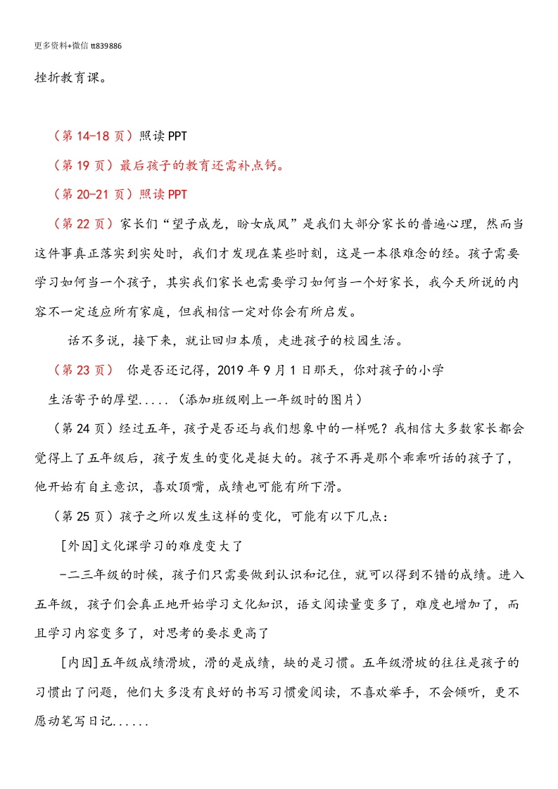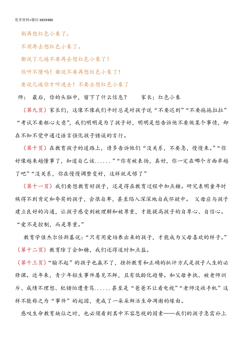 更多资料+微信t839886先放糖,后放盐,再补钙(第一页)各位家长大家下午好,首先非常感谢各位家长从百忙中抽时间出来赴这场“秋日之约”。历经疫情、网课,我们这一次时隔多年的齐聚一堂更多是想和许久未见的家长们一起聚焦当下,蓄能未来。今天,我们家长会的主题是“先放糖,后放盐,再补钙”。(第二页)清华附小校长窦桂梅说:“最好的家庭教育,是先放糖,后放盐,再补钙。”糖,是给孩子关爱与鼓励;盐,是教会孩子直面挫折;钙,是让孩子学会自强自立。其实啊,我们教育就像做菜一样,想要把一道菜做得好吃,缺一样调味料都是不可以的。著名校长李镇西曾说:“学校教育非常重要,但无论多么重要,都只是家庭教育的重要补充。”父母是孩子最好的老师,家庭教育更是孩子一生的起跑线。(第三页)所以我今天就把家庭教育放在了第一部分内容,希望各位家长能从中有所感悟。(第四页)心理学研究发现,经常听到赞美和鼓励的孩子往往具有更高的气质和思考能力,因此这也是我们一直强调的鼓励对孩子的重要性。我们的第一部分内容就是“重视语言力量,给孩子的生活加点糖”(第五页)请家长们回忆一下,在我们的教育道路上,我们是否有经常鼓励我们的孩子呢?(第六页)还是,会常常对他(她)说:“看看人家孩子”“多大点事都做不好”“别人就考得好你就不行?“就这么点事你至于吗?”“不过是偶尔进步而已有什么好骄傲的!(第七页)下面我们来做个小游戏,请大家请跟着我完成以下活动(第八页)请大家跟着读一读不要再去想红色小象了。