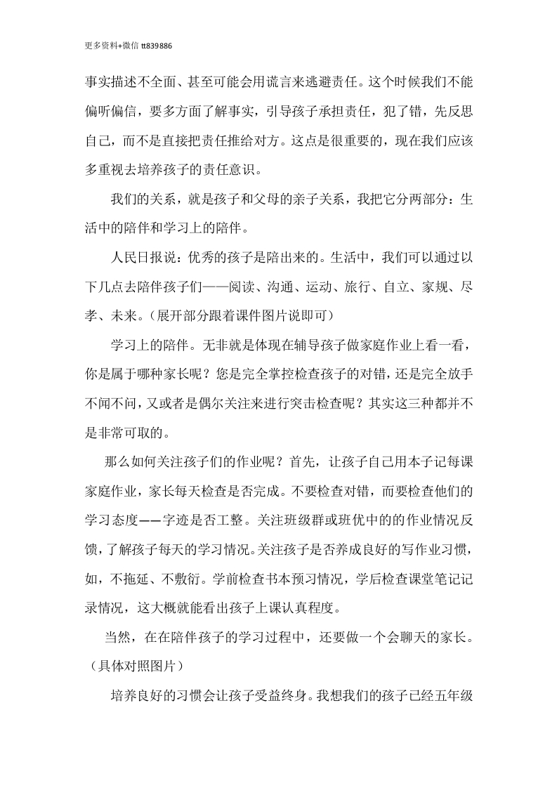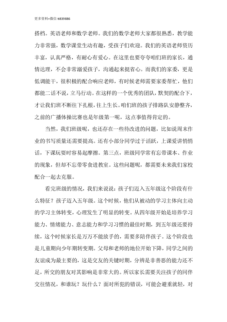更多资料+微信t839886厚积薄发,行稳致远家长会发言稿亲爱的家长朋友们晚上好!在这样充满希望的美好季节,在这春暖花开的晚上,疫情三年,真的是艰难的三年。三年后的今天,我们还能这样齐聚一堂围绕孩子的教育问题面对面展开交流,真是值得开心的一件事。今天,我把我们的班级家长会主题定为:厚积薄发,行稳致远。我觉得学习这件事是一个循序渐进的过程,唯有平常不断积累,关键时刻才能爆发。我们不是要走的多快,而是要走得稳当,方能走得更远。今天,我们的家长会分五项议程:我们的班级、五年级的阶段特征、好习惯的养成、我们的关系(亲子关系)、班级的未来。首先,请家长们一起来看看我们的班级。这是一张班集体发展目标阶段图,在我接咱们班的时候,他们己经是五年级的孩子了,我给我们的班级做了这样的一个规划:五六年级的时候,因为我们有了前面的基础,是希望我们的班级能够开始走向自主管理,实现由他律走向自律这个阶段。当然,我们的班级目前还没有完全达到这个目标,但正朝着这个目标努力在前行。现在我们班级的现状如何呢?我们班级总人数共人,其中男生人,女生人。咱们班的女孩儿都挺乖巧懂事,美丽大方的。每一个男生,都能热衷于班级事务,思维活跃。其次,要感谢我的两个
