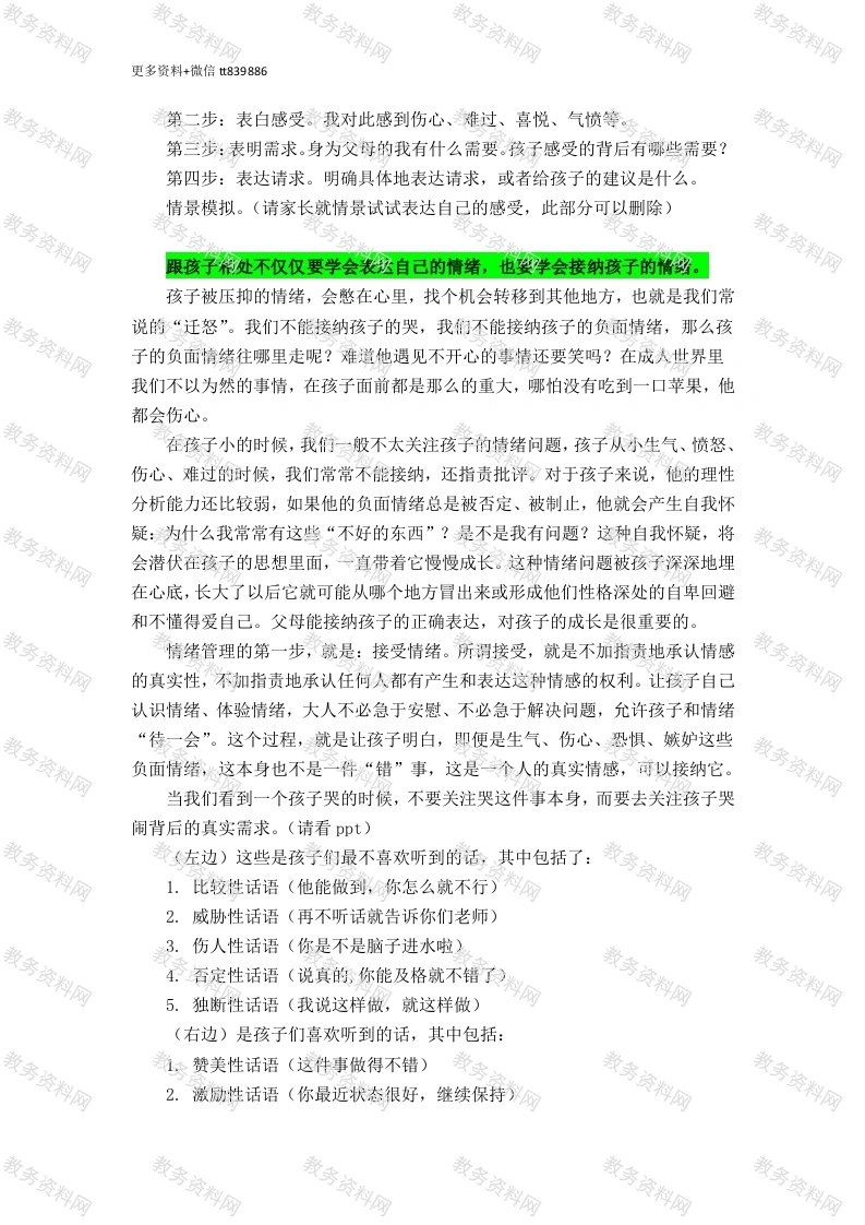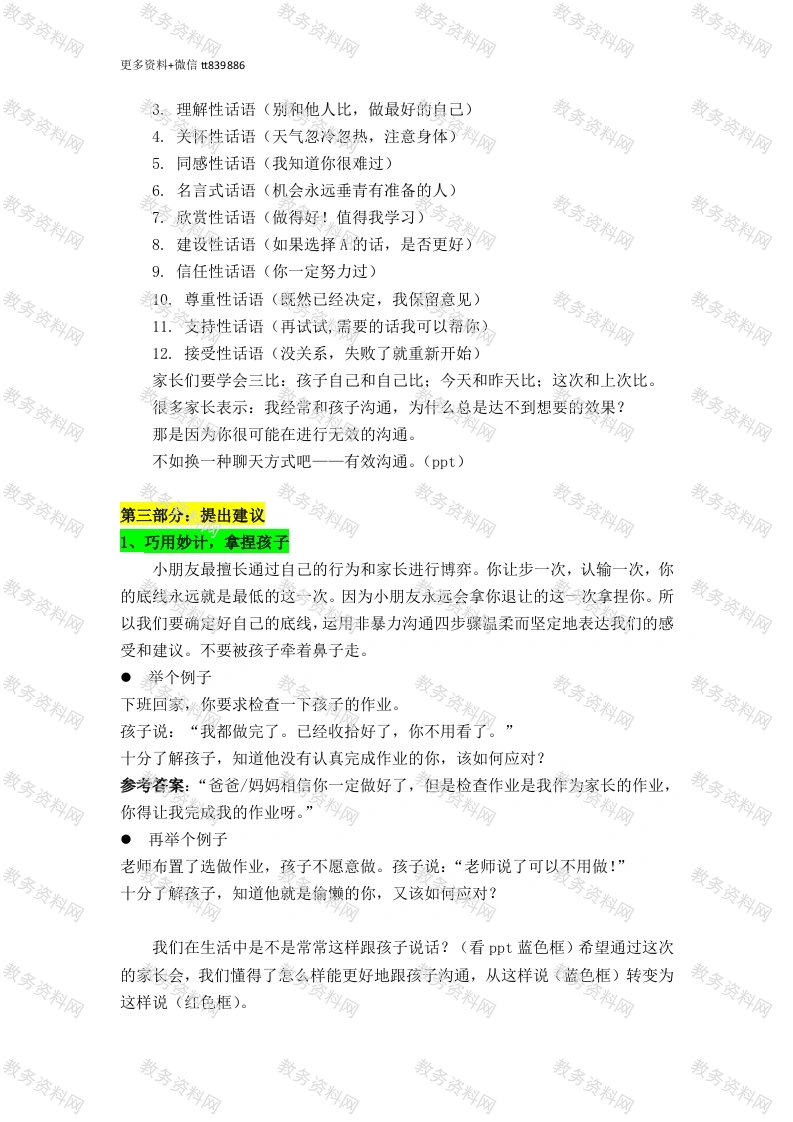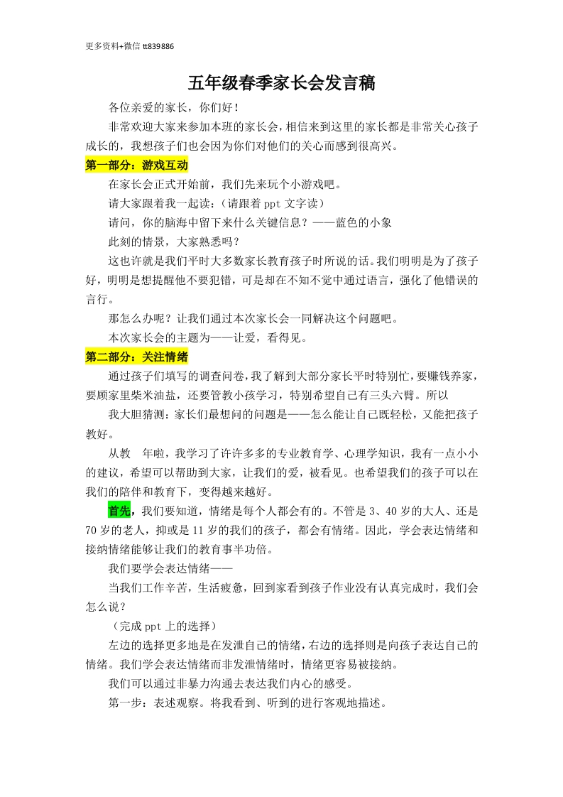 更多资料+微信t839886五年级春季家长会发言稿各位亲爱的家长,你们好!非常欢迎大家来参加本班的家长会,相信来到这里的家长都是非常关心孩子成长的,我想孩子们也会因为你们对他们的关心而感到很高兴。第一部分:游戏互动在家长会正式开始前,我们先来玩个小游戏吧。请大家跟着我一起读:(请跟着ppt文字读)请问,你的脑海中留下来什么关键信息?一一蓝色的小象此刻的情景,大家熟悉吗?这也许就是我们平时大多数家长教育孩子时所说的话。我们明明是为了孩子好,明明是想提醒他不要犯错,可是却在不知不觉中通过语言,强化了他错误的言行。那怎么办呢?让我们通过本次家长会一同解决这个问题吧。本次家长会的主题为一一让爱,看得见。第二部分:关注情绪通过孩子们填写的调查问卷,我了解到大部分家长平时特别忙,要赚钱养家,要顾家里柴米油盐,还要管教小孩学习,特别希望自己有三头六臂。所以我大胆猜测:家长们最想问的问题是一一怎么能让自己既轻松,又能把孩子教好。从教年啦,我学习了许许多多的专业教育学、心理学知识,我有一点小小的建议,希望可以帮助到大家,让我们的爱,被看见。也希望我们的孩子可以在我们的陪伴和教育下,变得越来越好。首先,我们要知道,情绪是每个人都会有的。不管是3、40岁的大人、还是70岁的老人,抑或是11岁的我们的孩子,都会有情绪。因此,学会表达情绪和接纳情绪能够让我们的教育事半功倍。我们要学会表达情绪一一当我们工作辛苦,生活疲惫,回到家看到孩子作业没有认真完成时,我们会怎么说?(完成ppt上的选择)左边的选择更多地是在发泄自己的情绪,右边的选择则是向孩子表达自己的情绪。我们学会表达情绪而非发泄情绪时,情绪更容易被接纳。我们可以通过非暴力沟通去表达我们内心的感受。第一步:表述观察。将我看到、听到的进行客观地描述。