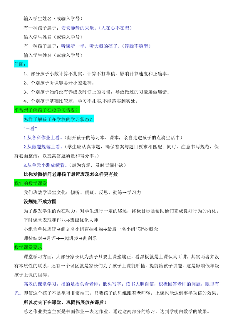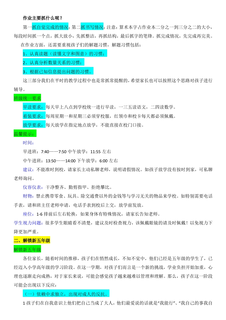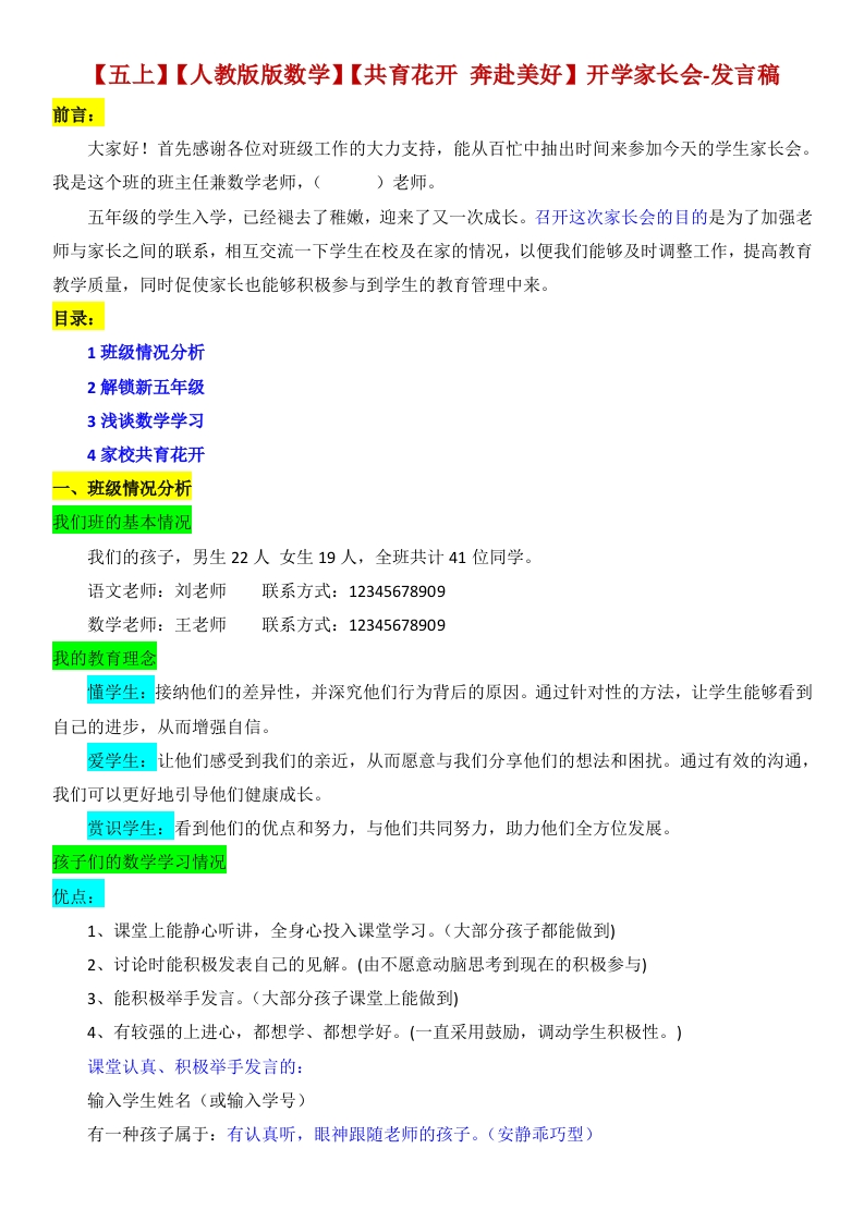 【五上】【人教版版数学】【共育花开奔赴美好】开学家长会-发言稿前言:大家好!首先感谢各位对班级工作的大力支持,能从百忙中抽出时间来参加今天的学生家长会。我是这个班的班主任兼数学老师,()老师。五年级的学生入学,已经褪去了稚嫩,迎来了又一次成长。召开这次家长会的目的是为了加强老师与家长之间的联系,相互交流一下学生在校及在家的情况,以便我们能够及时调整工作,提高教育教学质量,同时促使家长也能够积极参与到学生的教育管理中来。目录:1班级情况分析2解锁新五年级3浅谈数学学习4家校共育花开、班级情况分析我们班的基本情况我们的孩子,男生22人女生19人,全班共计41位同学。语文老师:刘老师联系方式:12345678909数学老师王老师联系方式:12345678909我的教育理念懂学生:接纳他们的差异性,并深究他们行为背后的原因。通过针对性的方法,让学生能够看到自己的进步,从而增强自信。爱学生:让他们感受到我们的亲近,从而愿意与我们分享他们的想法和困扰。通过有效的沟通,我们可以更好地引导他们健康成长。赏识学生:看到他们的优点和努力,与他们共同努力,助力他们全方位发展。孩子们的数学学习情况优点:1、课堂上能静心听讲,全身心投入课堂学习。(大部分孩子都能做到)2、讨论时能积极发表自己的见解。(由不愿意动脑思考到现在的积极参与)3、能积极举手发言。(大部分孩子课堂上能做到)4、有较强的上进心,都想学、都想学好。(一直采用鼓励,调动学生积极性。)课堂认真、积极举手发言的:输入学生姓名(或输入学号)有一种孩子属于:有认真听,眼神跟随老师的孩子。(安静乖巧型)