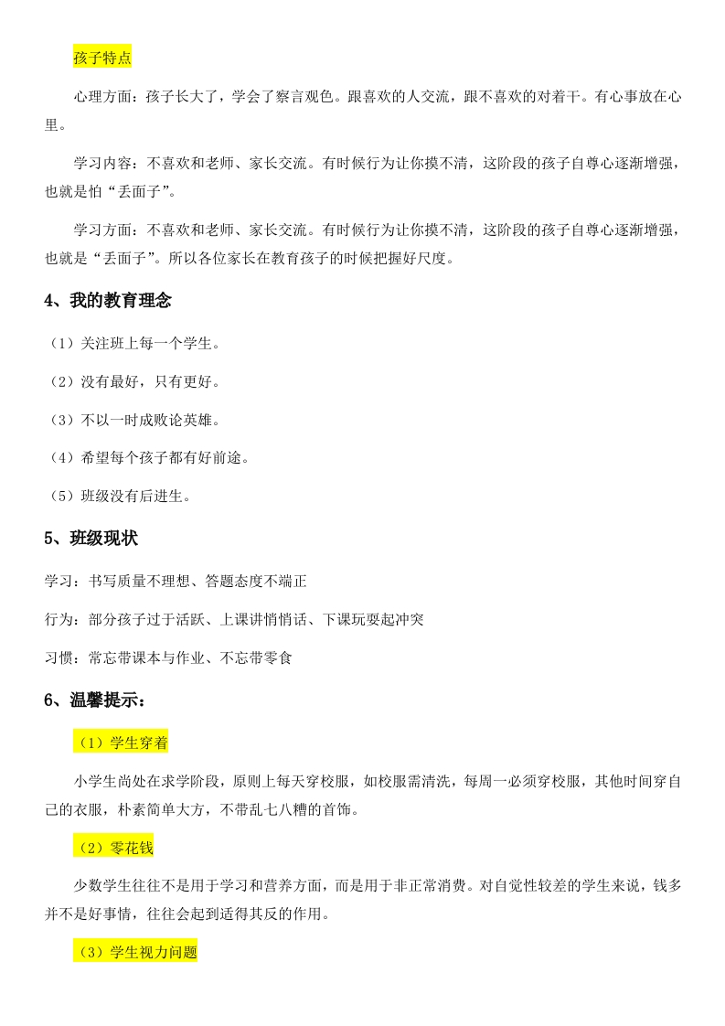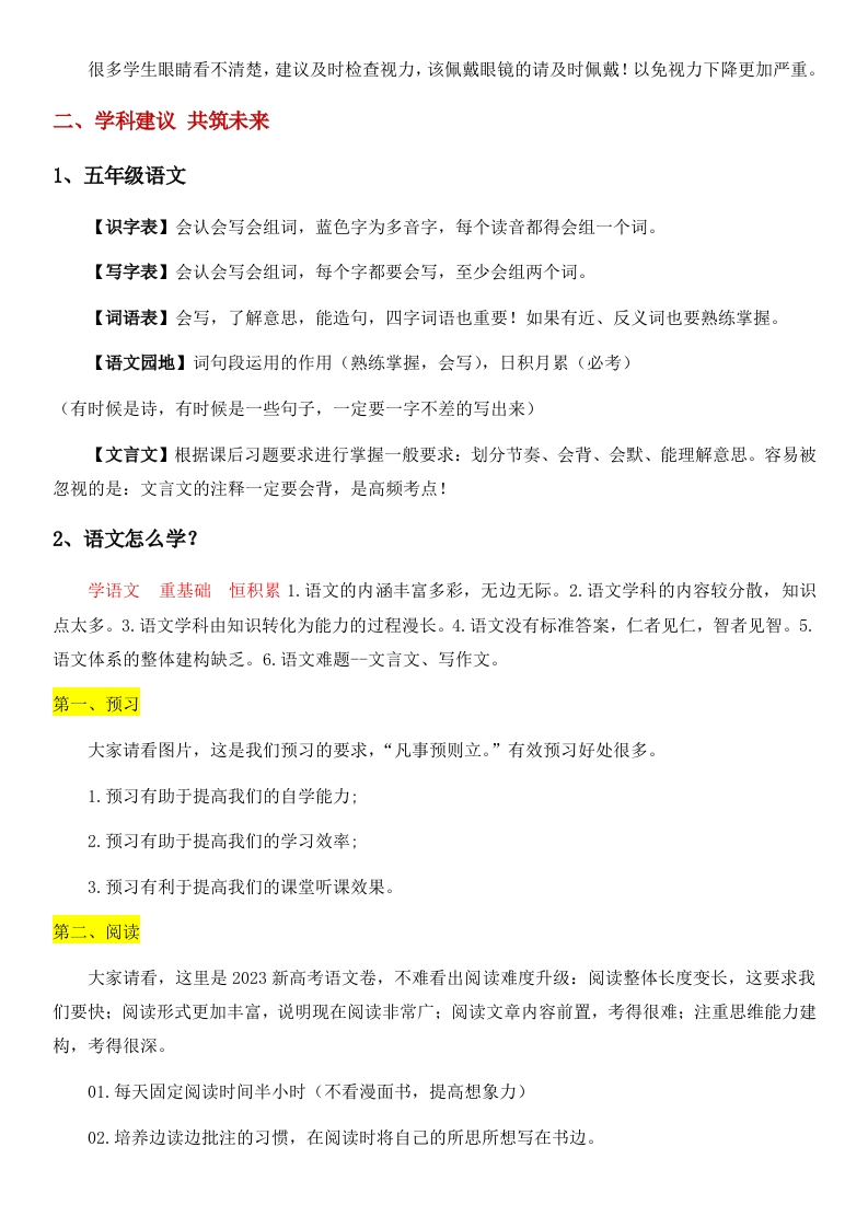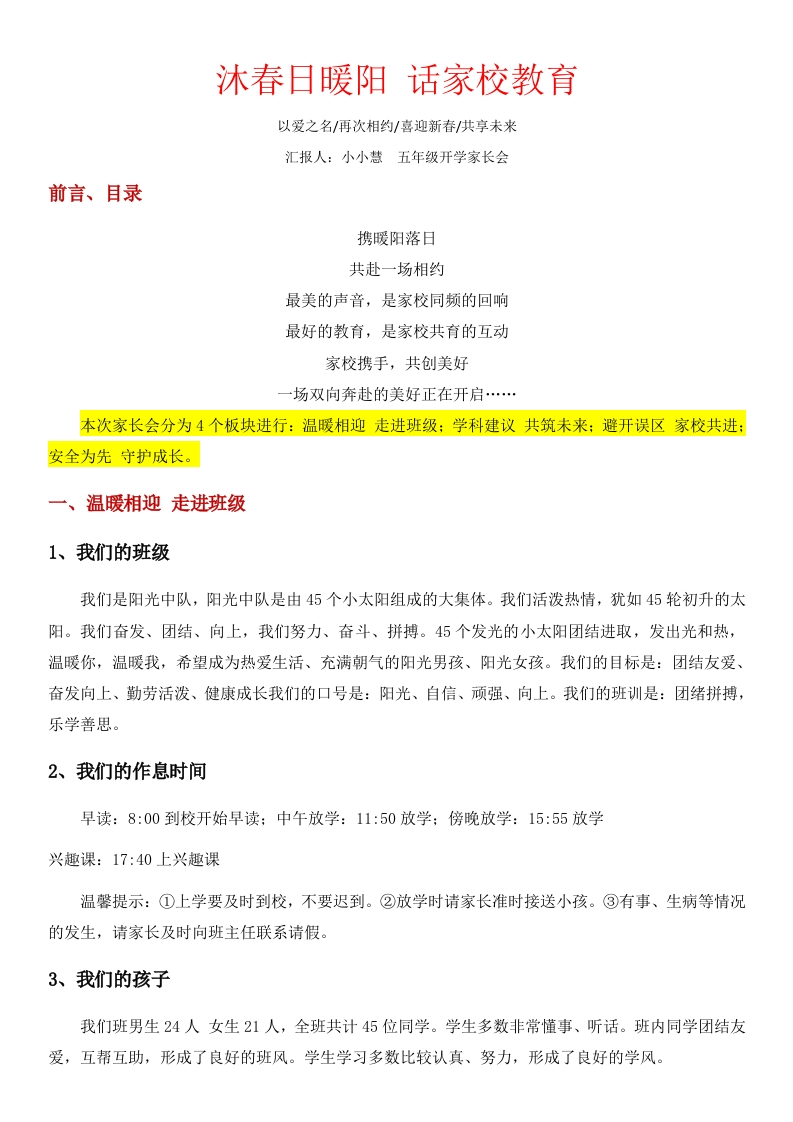 沐春日暖阳话家校教育以爱之名/再次相约/喜迎新春/共享未来汇报人:小小慧五年级开学家长会前言、目录携暖阳落日共赴一场相约最美的声音,是家校同频的回响最好的教育,是家校共育的互动家校携手,共创美好一场双向奔赴的美好正在开启…本次家长会分为4个板块进行:温暖相迎走进班级:学科建议共筑未来:避开误区家校共进:安全为先守护成长。一、温暖相迎走进班级1、我们的班级我们是阳光中队,阳光中队是由45个小太阳组成的大集体。我们活泼热情,犹如45轮初升的太阳。我们奋发、团结、向上,我们努力、奋斗、拼搏。45个发光的小太阳团结进取,发出光和热,温暖你,温暖我,希望成为热爱生活、充满朝气的阳光男孩、阳光女孩。我们的目标是:团结友爱、奋发向上、勤劳活泼、健康成长我们的口号是:阳光、自信、顽强、向上。我们的班训是:团绪拼搏,乐学善思。2、我们的作息时间早读:8:00到校开始早读:中午放学:11:50放学:傍晚放学:15:55放学兴趣课:17:40上兴趣课温馨提示:①上学要及时到校,不要迟到。②放学时请家长准时接送小孩。③有事、生病等情况的发生,请家长及时向班主任联系请假。3、我们的孩子我们班男生24人女生21人,全班共计45位同学。学生多数非常懂事、听话。班内同学团结友爱,互帮互助,形成了良好的班风。学生学习多数比较认真、努力,形成了良好的学风。
