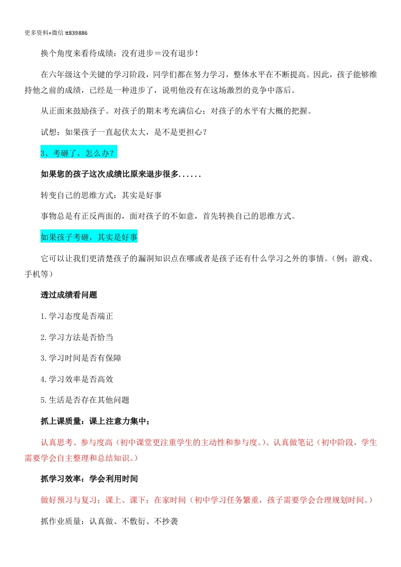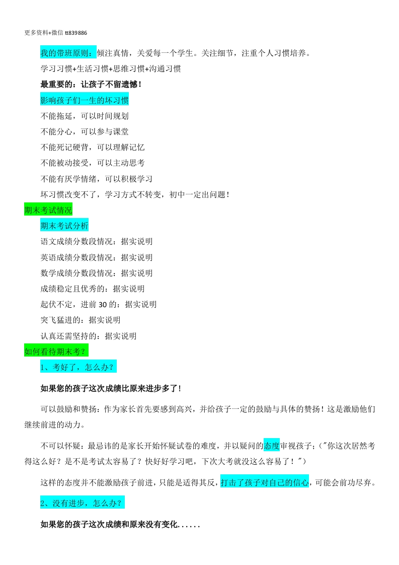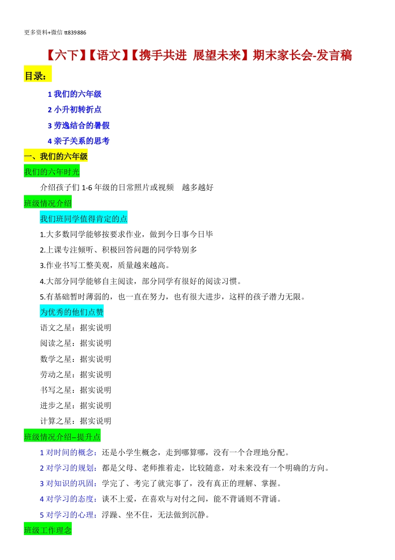 更多资料+微信t839886【六下】【语文】【携手共进展望未来】期末家长会-发言稿目录:1我们的六年级2小升初转折点3劳逸结合的暑假4亲子关系的思考、我们的六年级我们的六年时光介绍孩子们1-6年级的日常照片或视频越多越好班级情况介绍我们班同学值得肯定的点1.大多数同学能够按要求作业,做到今日事今日毕2.上课专注倾听、积极回答问题的同学特别多3.作业书写工整美观,质量越来越高。4大部分同学能够自主阅读,部分同学有很好的阅读习惯。5.有基础暂时薄弱的,也一直在努力,也有很大进步,这样的孩子潜力无限。为优秀的他们点赞语文之星:据实说明阅读之星:据实说明数学之星:据实说明劳动之星:据实说明书写之星:据实说明进步之星:据实说明计算之星:据实说明班级情况介绍-提升点1对时间的概念:还是小学生概念,走到哪算哪,没有一个合理地分配。2对学习的规划:都是父母、老师推着走,比较随意,对未来没有一个明确的方向。3对知识的巩固:学完了、考完了就完事了,没有真正的理解、掌握。4对学习的态度:谈不上爱,在喜欢与对付之间,能不背诵则不背诵。5对学习的心理:浮躁、坐不住,无法做到沉静。班级工作理念