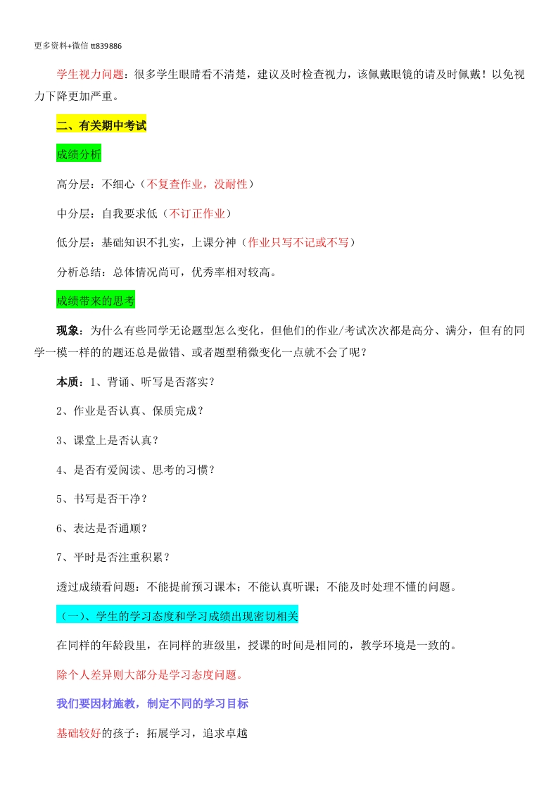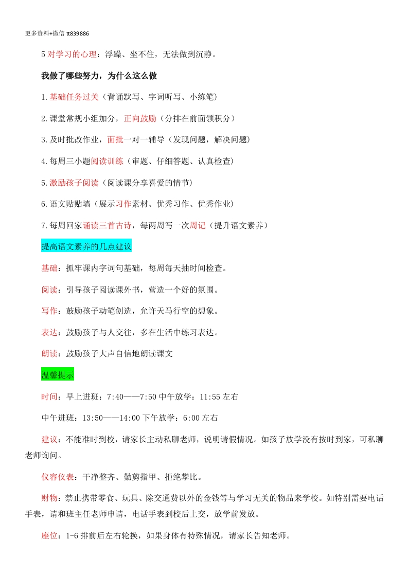 更多资料+微信t839886【六下】【语文】【毕业在即,家校共话未来】期中家长会各位尊敬地家长们:你们好,我们这次召开家长会的目的是:小学六年级,学生在小学学习生活中步入了最后一个阶段,是学生终生学习的一个中转站,对学生的一生具有重要的意义。关键期:小学六年级,也是小学与初中的接轨点,学生素质的高低,成绩的好坏,即将面临到一个新的环境中受到一个新的挑战、新的评价。目标一致:我们的目标是一致的,那就是:“一切为了孩子,为了孩子的一切!接下来我来就5个板块来讲述下本次家长会,依次分别为:不知不觉已长大:有关期中考试:谈谈小升初:望闻问切守护成长。一、不知不觉已长大我们的六年时光:插入孩子们1-6年级的日常照片越多越好重要事件:校园足球比赛(冠军)全校(优秀班集体)获得区级(大合唱比赛亚军)秋季运动会总分(第一名)我们班同学值得肯定的点:1.大多数同学能够按要求作业,做到今日事今日毕。2.上课专注倾听、积极回答问题的同学特别多。3.作业书写工整美观,质量越来越高。4.大部分同学能够自主阅读,部分同学有很好的阅读习惯。5.有基础暂时薄弱的,也一直在努力,也有很大进步,这样的孩子潜力无限。需要提升的点1对时间的概念:还是小学生概念,走到哪算哪,没有一个合理地分配。2对学习的规划:都是父母、老师推着走,比较随意,对未来没有一个明确的方向。3对知识的巩固:学完了、考完了就完事了,没有真正的理解、掌握。4对学习的态度:谈不上爱,在喜欢与对付之间,能不背诵则不背诵。