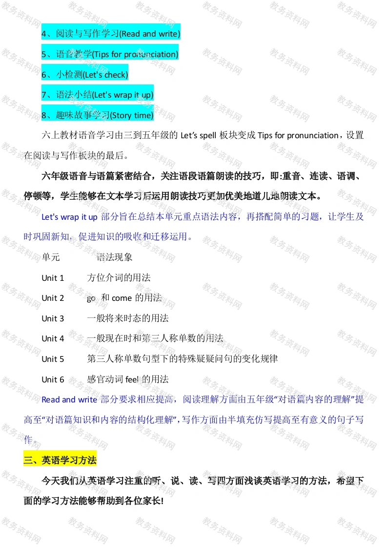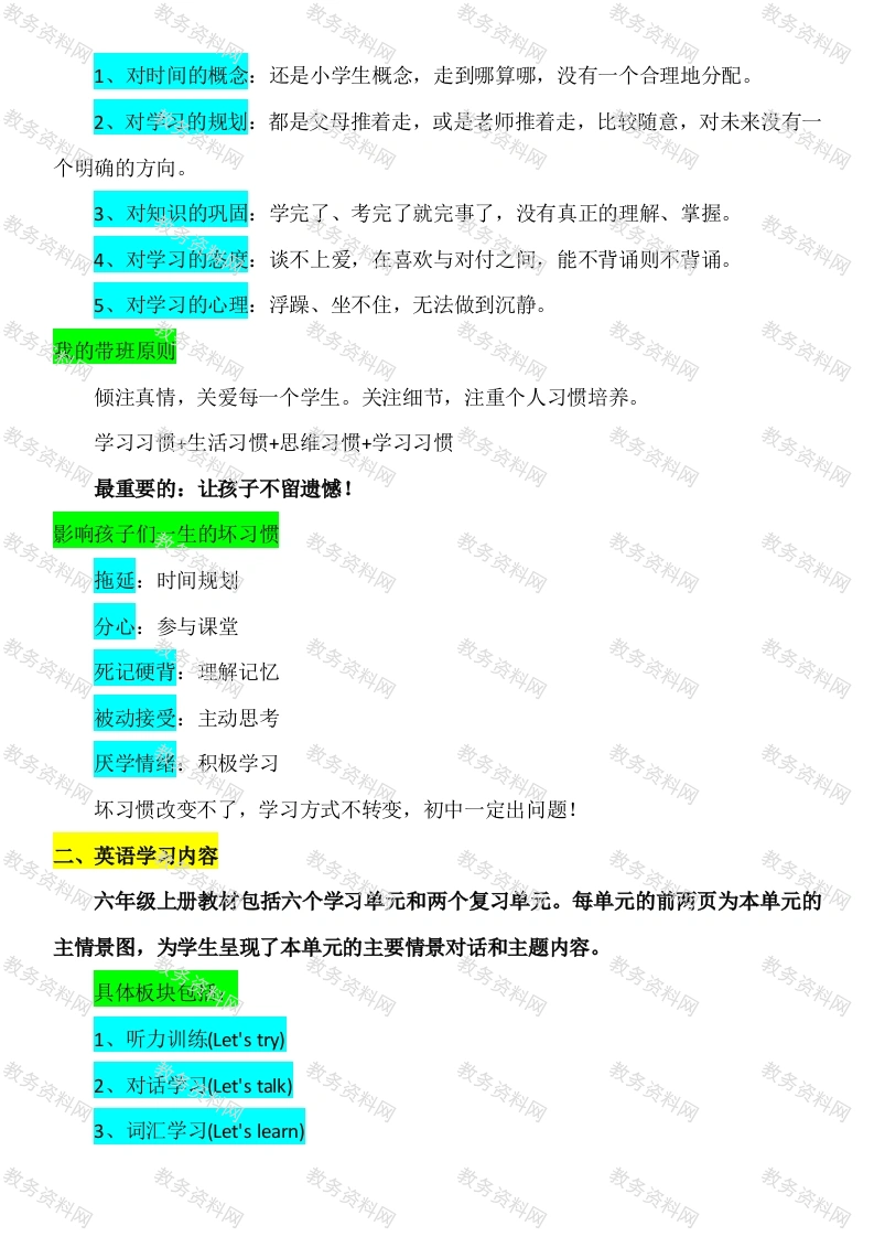 【六上】【英语】【守望成长共享喜悦】开学家长会-发言稿目录:01班级情况介绍02英语学习内容03英语学习方法04家校共促成长、班级情况介绍回顾暑假生活暑假作业认真的孩子:家长如何帮助孩子收心?(总结、调整、谈心、计划和准备)首先,孩子在暑假生活和学习状况和孩子们进行总结。然后,调整好孩子的作息时间和饮食生活习惯。接着,和孩子谈谈心,了解孩子对新学期的打算。最后,制定新学期计划和准备好学具。让孩子尽快转换角色,从暑假收心,适应学校生活。班级基本情况我们班同学值得肯定的点1.大多数同学能够按要求作业,做到今日事今日毕2.上课专注倾听、积极回答问题的同学特别多3.作业书写工整美观,质量越来越高。4.大部分同学能够自主阅读,部分同学有很好的阅读习惯。5.有基础暂时薄弱的,也一直在努力,也有很大进步,这样的孩子潜力无限。班级基本情况一一提升点