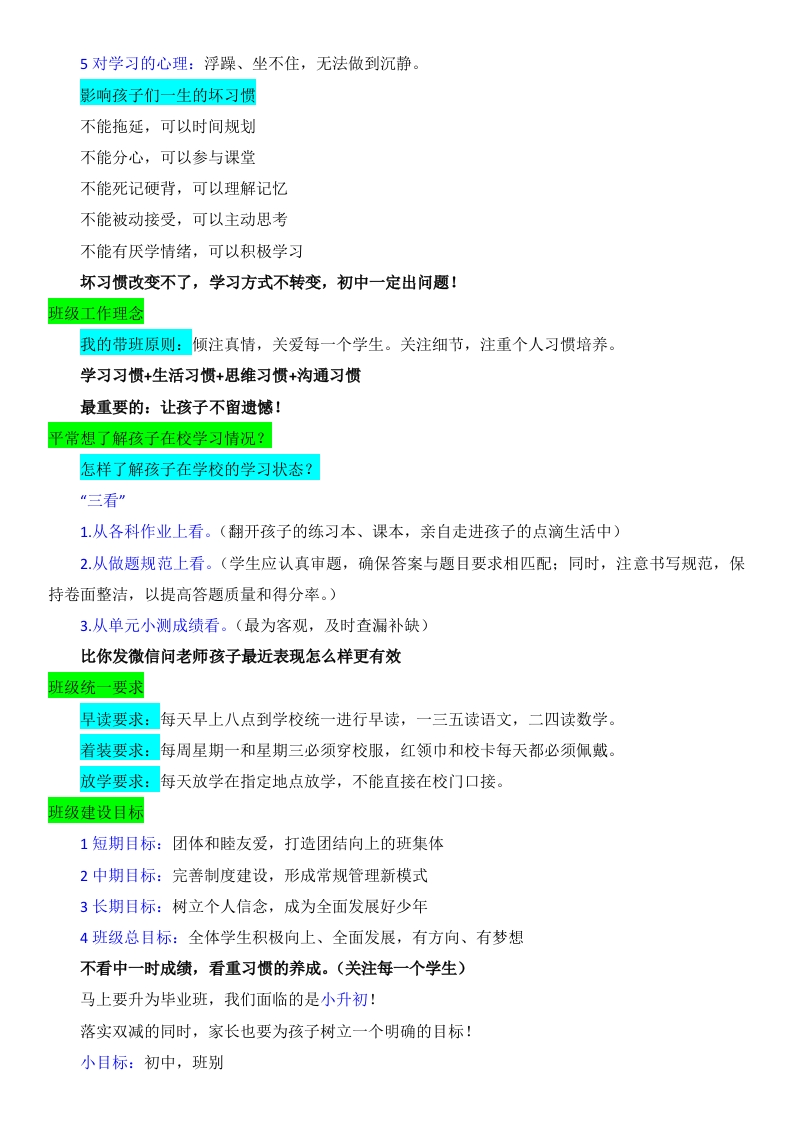 【六上】【北师大版数学】【携“数”共育共启新航】开学家长会-发言稿目录:1好的开始:本学期目标2新的挑战:认识六年级3提前布局:共看小升初4携手共育:青春期教育一、好的开始:本学期目标回顾我们的小学时光介绍孩子们1-5年级的日常照片或视频越多越好我们班的基本情况我们的孩子,男生22人女生19人,全班共计41位同学。语文老师:刘老师联系方式:12345678909数学老师:王老师联系方式:12345678909我们班同学值得肯定的点1.课堂上能静心听讲,全身心投入课堂学习。(大部分孩子都能做到)2讨论时能积极发表自己的见解。(由不愿意动脑思考到现在的积极参与)】3.能积极举手发言。(大部分孩子课堂上能做到)4.有较强的上进心,都想学、都想学好。(一直采用鼓励,调动学生积极性。)不同孩子的状态课堂认真、积极举手发言的:输入学生姓名(或输入学号)有一种孩子属于:有认真听,眼神跟随老师的孩子。(安静乖巧型)输入学生姓名(或输入学号)有一种孩子属于:安安静静的呆坐。(人在心不在型)输入学生姓名(或输入学号)有一种孩子属于:听课听一半,听大概的孩子。(浮躁不稳型)输入学生姓名(或输入学号)孩子们需要进步的地方1对时间的概念:还是小学生概念,走到哪算哪,没有一个合理地分配。2对学习的规划:都是父母、老师推着走,比较随意,对未来没有一个明确的方向。3对知识的巩固:学完了、考完了就完事了,没有真正的理解、掌握。4对学习的态度:谈不上爱,在喜欢与对付之间,能不背诵则不背诵。
