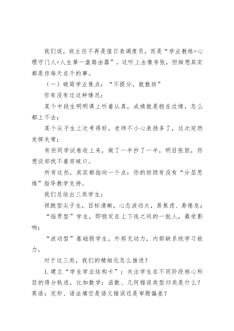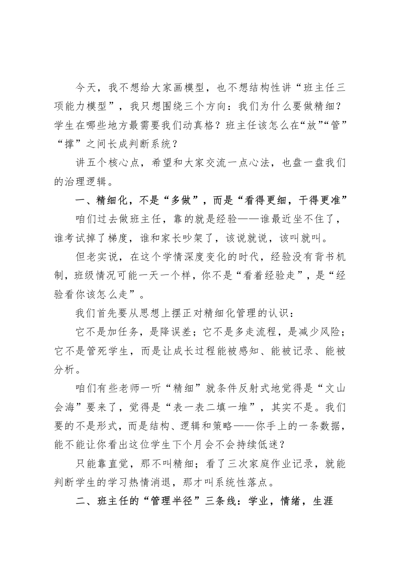 “不只是管纪律,更是在育未来”一一校长在高中班主任精细化管理培训会的深度发声各位老师,大家上午好!今天和大家见面,谈的不是概念,也不是技术路径,而是咱们班主任工作中最实在也最琐碎的一块一一“你每天在做,但未必做深;你经常在想,但未必成体系”的那件事,精细化管理。今天选这个主题,其实是因为我最近频繁和三年级心态不稳的学生谈话,跟家长通电话,和老师们讨论教学进度,也在复盘我们前期在班级治理中的痛点一一有一些问题,单靠经验不够用了,单靠情怀也兜不住了。所以现在这个节点,几件事叠加在一起:秋季学期节奏加快,教学做完了三轮检测,成绩压力开始落底;新高考模式下,“选科一专业一职业”联动效应越发显性,学生在焦虑中试图寻找出路;高中生的自主意识明显增强,从“听管”到“想怎么管”,但管理尺度不好拿捏;家校关系的敏感线越来越低,家长希望孩子“保持稳定”,却常议校规,于预管理。这一切都告诉我们:原来你能靠“经验维持”的班级秩序,已经到了非“方法支持”不可的阶段了。