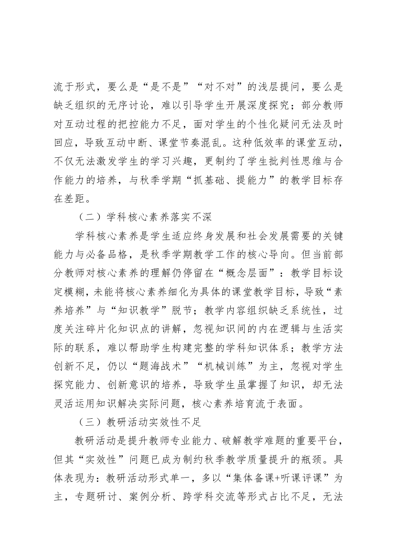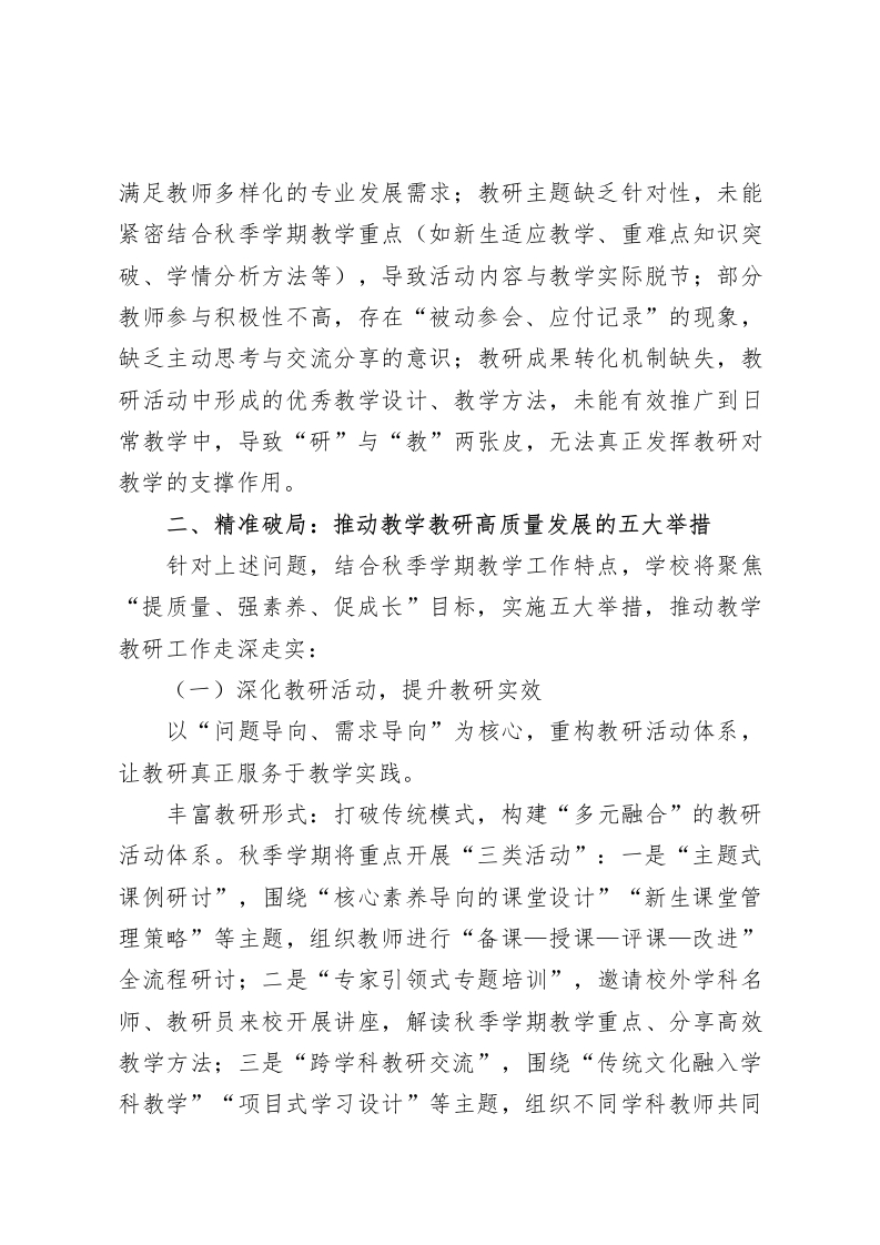 “三大问题、五大举措、六大要求”!全面推动学校高质量发展一一2025年秋季学期教学与教研工作大会讲话尊敬的各位老师:大家好!在这满载收获、开启新程的秋季学期,我们怀着对教育事业的热忱与担当,齐聚一堂召开2025年秋季学期第一次教学与教研工作大会。过去一学期,全体教师深耕三尺讲台,在教学改革、学生培养等方面取得了阶段性成果。但站在教育高质量发展的新赛道上,我们必须清醒审视当前工作,直面存在的短板与挑战。今天,我将围绕“三大问题、五大举措、六大要求”,与大家共同谋划新学期教学教研工作方向,以务实行动破解难题,以创新思维推动发展,携手谱写学校教育事业新篇章。一、直面不足:当前教学教研工作存在的三大问题教学教研是学校发展的“生命线”,其质量直接决定学生成长高度与学校办学水平。结合秋季学期教学开局实际,对照新时代教育改革要求,当前工作主要面临以下三大突出问题:(一)课堂互动效率偏低课堂是知识传递与思维碰撞的核心场域,高效互动是激活课堂活力的关键。但目前部分课堂仍存在“教师单向输出、学生被动接收”的现象:部分教师习惯沿用“讲授式”教学,过度依赖课件演示,留给学生思考、表达的时间不足;互动设计