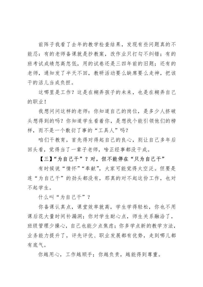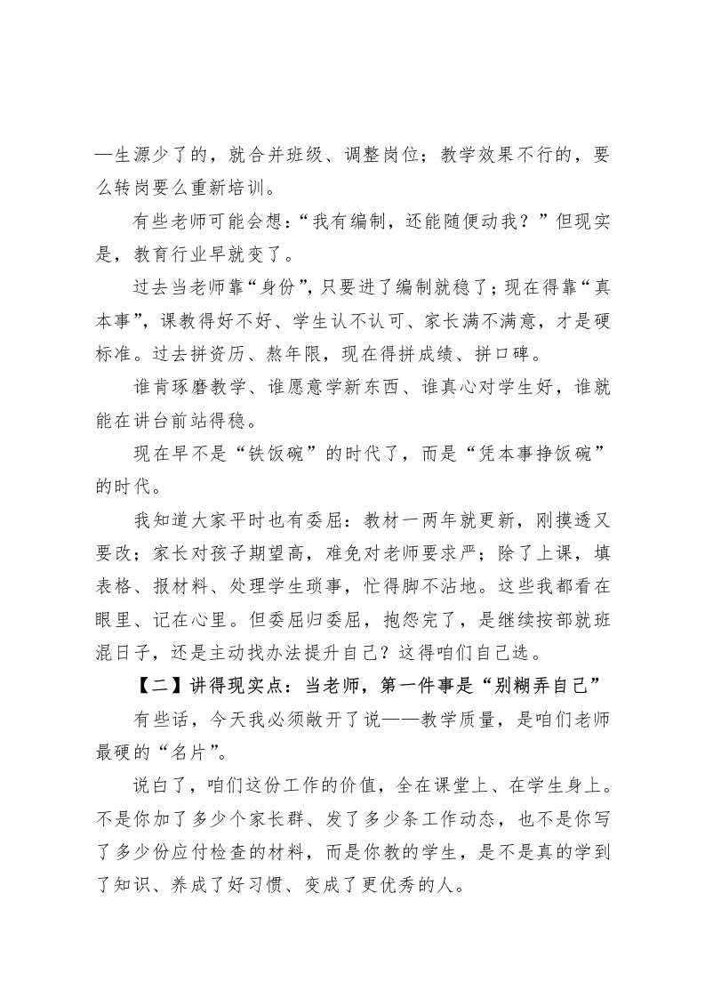 2025年秋季开学全体教职工大会,校长讲话:35分钟会议,把所有老师“点醒”到位!各位老师,亲爱的同仁们:大家上午好!暑假的余温还没散,校园里就又热闹起来了一一学生们背着书包回来了,教室的灯重新亮起来了,咱们这群教育路上的同行,也又聚到了一起。说真的,今天站在这里,我心里又高兴又着急。高兴的是新学期又能和大家并肩干,着急的是咱们队伍里有些问题,再不说透、再不解决,真要跟不上形势了。今天这会不搞虚的,不读长篇文件,不搞形式主义。就跟大家聊三个实打实的问题:咱们当老师,到底图个啥、该扛啥?新学期的活儿,该怎么干才见效?要是敷衍应付,到底行不行?希望三十五分钟后,大家能真真切切有感触、有想法,而不是听完就忘。要是能让你心里“咯噔”一下,琢磨琢磨自己接下来该咋干,那我今天这话说得就值了。【一】我们凭什么在这个座位上?一一“编制不是躺平的资本,责任才是站稳的底气”先跟大家说句实在话:别再觉得有了编制就万事大吉,别把“稳定”当成不使劲的理由。最近我打听了周边几个学校的情况,不少地方都在调整一