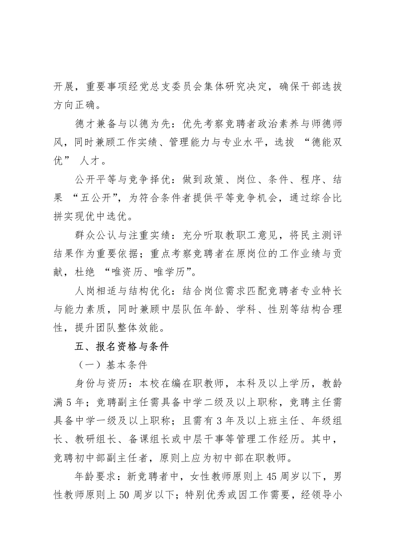 2025年学校中层干部竞聘上岗工作方案为深入落实国家关于深化新时代教育评价改革及中小学校领导人员管理体制改革的要求,进一步优化学校内部治理结构,激发管理队伍活力,建设政治坚定、德才兼备、业务精湛、管理高效、充满活力的中层干部队伍,为学校高质量可持续发展提供坚实组织保障与人才支撑,结合我校实际,特制定本方案。一、指导思想以习近平新时代中国特色社会主义思想为根本遵循,全面贯彻党的教育方针,坚持党管干部原则,以“公开、平等、竞争、择优”为核心导向,深化干部人事制度改革,拓宽选人用人渠道,完善民主公开、竞争择优的干部选拔机制。通过科学规范的竞聘程序,选拔理想信念坚定、热爱教育事业、师德高尚、业务扎实、富有开拓创新精神、善于管理协调且群众公认度高的优秀人才进入中层管理岗位,激发全体教职工干事创业的积极性与创造性,为推动学校内涵式发展、办好人民满意的教育筑牢基础。二、组织领导为确保竞聘工作有序、合规、公正推进,成立三级工作机构,明确职责分工:(一)领导小组组成:组长由校长、党总支书记担任;副组长为副校长、副书记;成员包括其他校级领导、工会主席及1-2名教师代表。