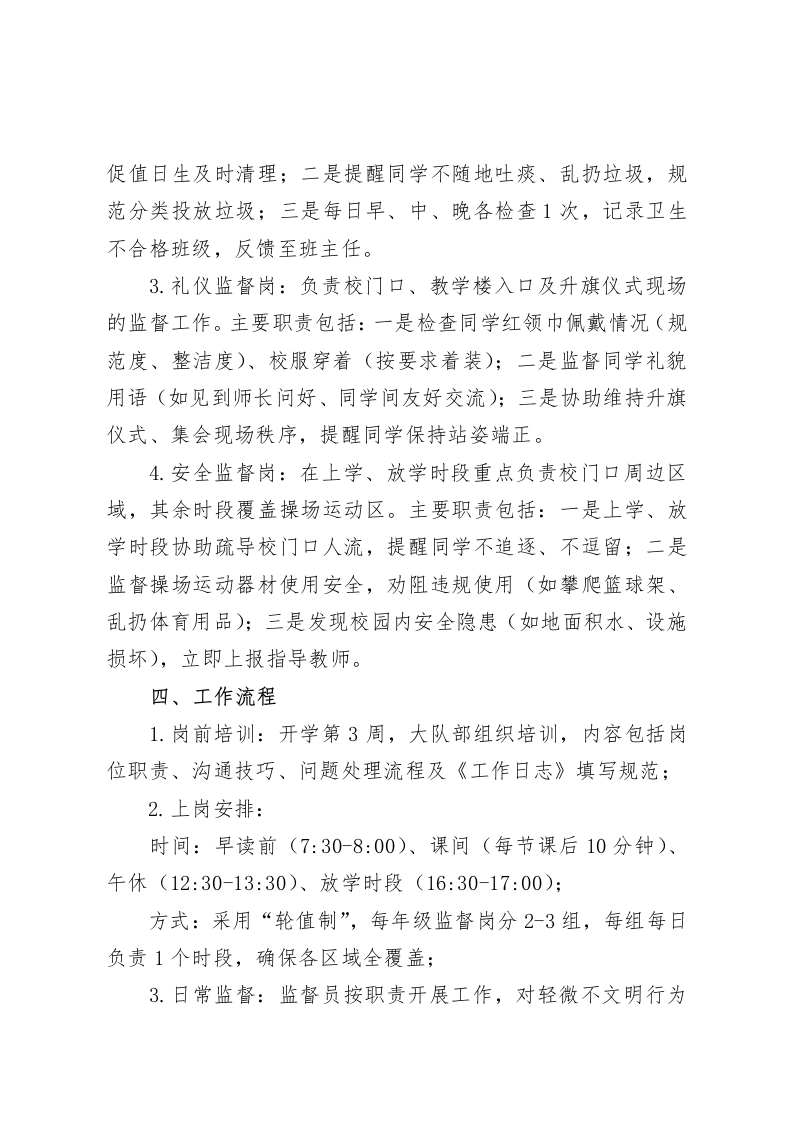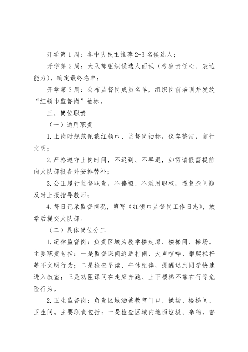 2025学年第一学期学校红领巾监督岗实施细则一、指导思想以《中国少年先锋队章程》为依据,围绕学校“立德树人”根本任务,通过红领巾监督岗的自我管理、自我服务、自我教育,营造文明、有序、和谐的校园环境,培养队员的责任意识、规则意识和服务精神,助力优良校风、学风建设。二、组织机构及人员选拔(一)组织机构1.统筹部门:学校少先队大队部,负责监督岗整体规划、协调、培训及考核;2.指导教师:大队辅导员及各年级中队辅导员,负责日常工作指导、问题协调;3.监督岗队伍:设大队监督岗(3-5人,由五、六年级队员担任,负责统筹各年级工作)和年级监督岗(每年级5-8人,由三至六年级各中队推荐,负责本年级区域监督)。(二)人员选拔1.选拔条件:品学兼优,遵守校纪校规,能以身作则:责任心强,有服务意识,乐于为同学、校园服务:沟通能力良好,能公正、温和处理简单问题;佩戴红领巾规范,仪容仪表符合学校要求。2.选拔流程: