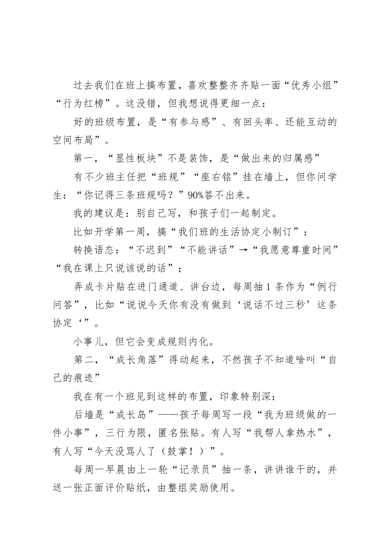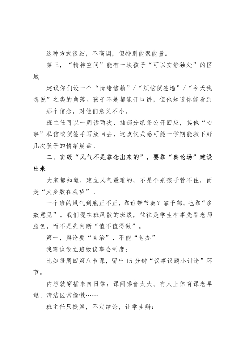 班风正则人心齐,德育强则校园稳一一德育副校长在班主任会议上的一番话引发深度共鸣各位班主任同志:大家上午好!今天把大家请来,不是例会流程,也不是任务布置,而是真心实意地想和大家聊聊一个我们重复提、经常做、但现在可能该“重抠一遍”的老问题一一班风建设。我们常讲“德育为先、教学为本”,但如果班风不正,所有管理都会显得很吃力。你讲规矩,没人听;你讲方法,不愿学;你提要求,被质疑;最后累的是谁?班主任自己。你们是年级里的第一道防线,是教室里学生的“情绪调节阀”“习惯锁定员”“思想导航灯”。可以说,班风建设提不上来,其他什么教学节奏、成绩质量,基本只能靠天吃饭。今天这场培训,我想用一种交朋友的方式,和大家聊聊我自己这么多年做班主任、做年级主任、做德育负责人,一点一滴摸索出的几点经验。我总结为“班风建设的五个关键抓手”,内容不讲道理套话,咱就说实情、落实招。一、从教室布置起步,把制度“贴墙”,把文化“放进学生眼睛里”有时候你会发现,一个班的气质,一结课站在门口望一眼,你就感觉得出来。为什么?因为气场是“气养”出来的,而不是“贴条”贴出来的。