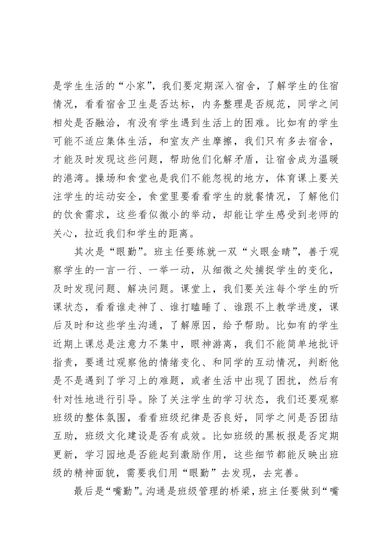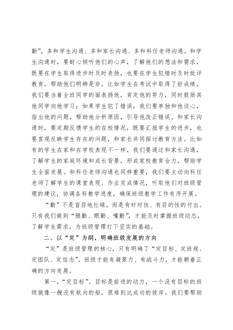 班级怎么管理?副校长在班主任会上精彩讲话:勤,定,守各位班主任老师:大家好!今天我们齐聚一堂,召开这次班主任工作会议,主要是想和大家交流探讨班级管理的核心要点,明确后续工作方向,提升班级管理水平。班主任是班级的“领头雁”,是学生成长路上的“引路人”,更是学校教育教学工作的中坚力量。班级管理工作琐碎而重要,想要把班级管理好,我认为关键在于三个字一一“勤”“定”“守”。这三个字看似简单,却蕴含着班级管理的大智慧,接下来我就围绕这三个字,和大家详细聊聊。一、以“勤”为基,筑牢班级管理的根基“勤”是班级管理的前提和基础,没有“勤”,班级管理就如同无源之水、无本之木。作为班主任,我们要做到“腿勤、眼勤、嘴勤”,用“勤”走进学生、了解学生、帮助学生,让班级管理更有温度、更有实效。首先是“腿勤”。班主任的脚步要遍布校园的各个角落,要多往教室跑、多往宿舍跑、多往操场跑、多往食堂跑。教室是学生学习的主阵地,我们要坚持早自习提前到岗,看看学生是否按时到校,有没有进入学习状态,桌椅摆放是否整齐,黑板是否擦干净;课间也要多到教室转转,观察学生的课间活动,及时制止追逐打闹等危险行为,化解学生之间的小矛盾。宿舍