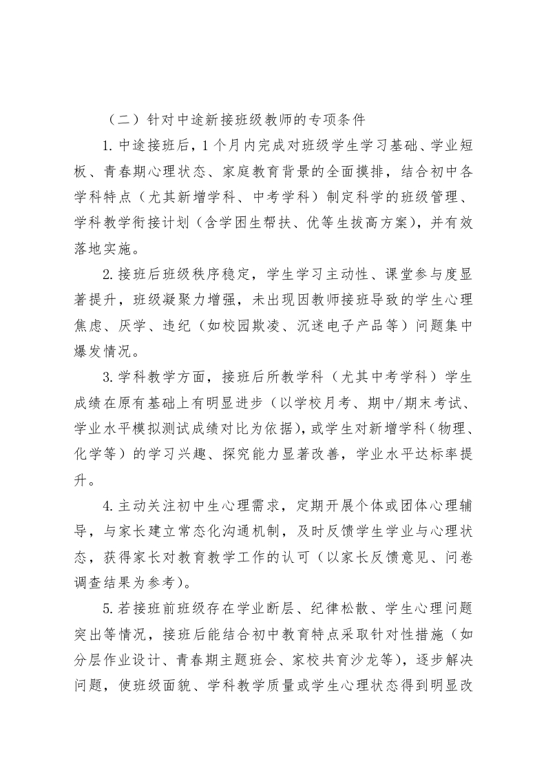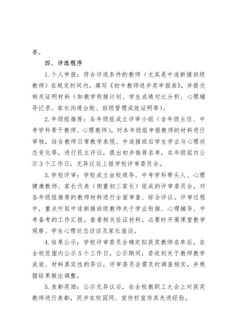 初中学校教师进步奖方案(含加分细则)(2025新订版)一、指导思想以促进初中教师专业成长、契合初中生青春期身心发展规律、提升教育教学质量与学业水平为核心,激发教师工作积极性与主动性,重点关注中途新接班级教师在学业衔接、心理引导、班级管理中的付出与成效,营造关注学生全面发展、教师争先创优的教育教学氛围。二、评选对象本校全体在职在岗教师,重点关注中途新接班级(含新接班主任工作、新接学科教学班级,尤其含初中学业水平考试学科、初中新增学科<物理、化学等>教学班级)的教师。三、评选条件(一)基本条件1.遵守国家法律法规和学校各项规章制度,具有良好的师德师风,关爱初中生青春期成长需求,尊重学生个性差异,为人师表,无任何违规违纪行为。2.认真履行教师职责,适配初中多学科教学与学业要求,教学态度端正,工作勤奋踏实,积极参与学校、学科组组织的中考备考、分层教学、心理健康教育等专项活动。3.注重自身专业发展,主动学习初中教育教学理论、中考命题趋势、青春期心理辅导方法,探索符合初中生认知规律的教学模式,提升教育教学与育人能力。