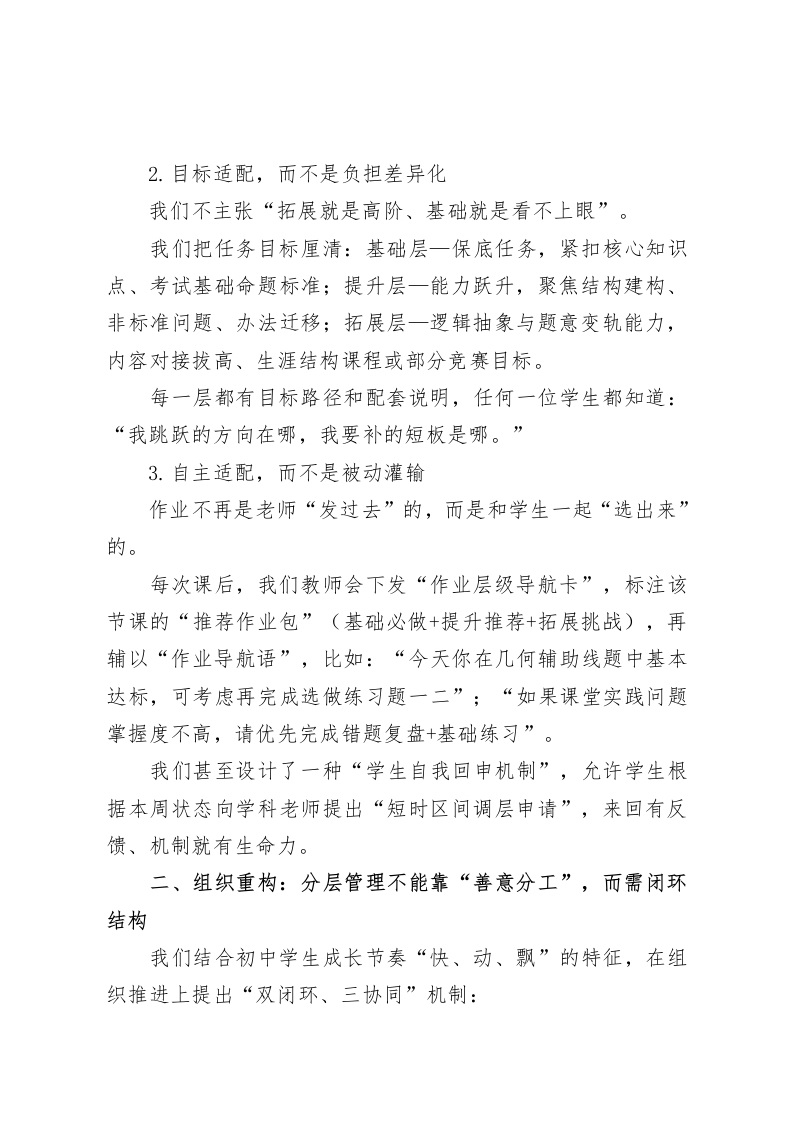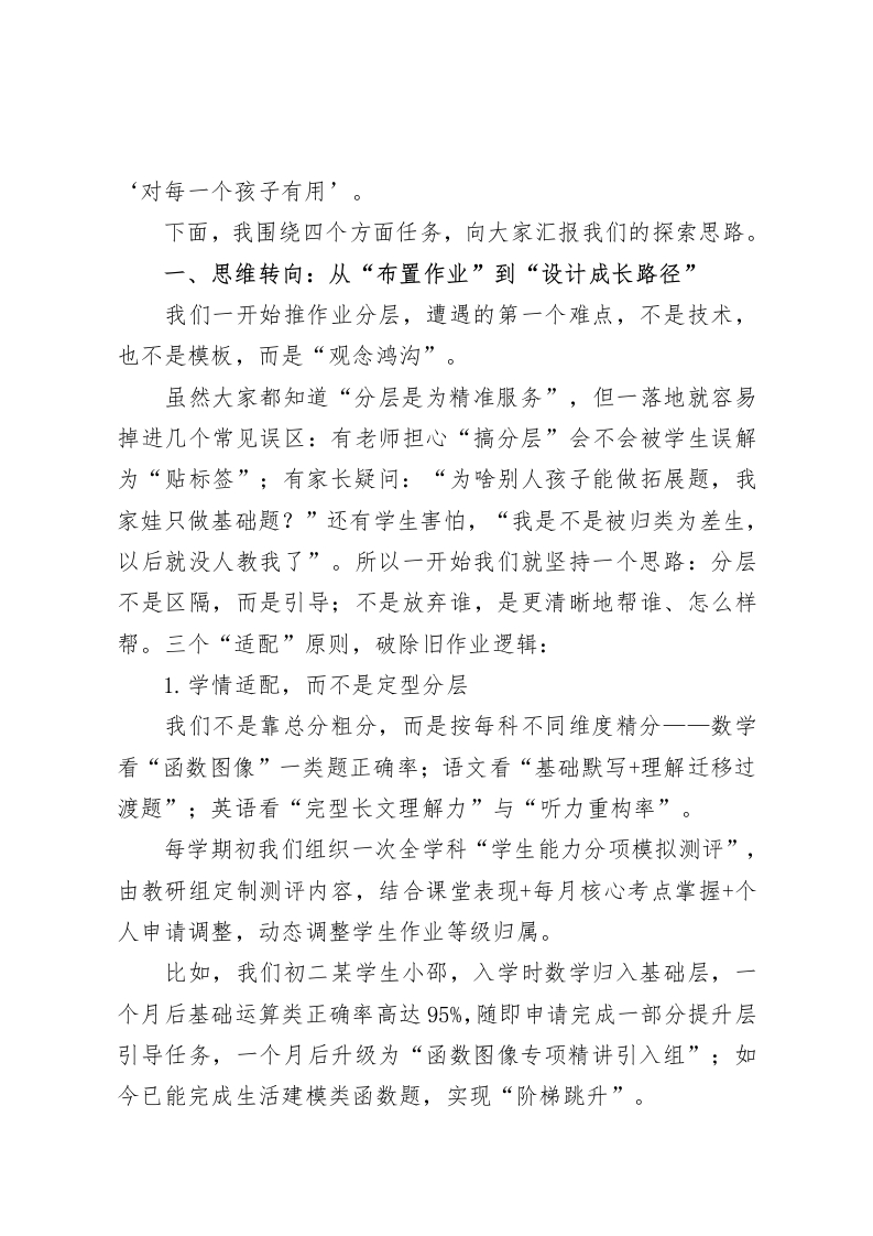 初中作业分层管理亮点工作,校长汇报发言:摆脱“刷题内卷”,走向“分层提质”尊敬的各位领导、各位专家,教育同仁们:大家好!今天有幸站在这样一个平台上,跟大家分享我们学校在作业“分层管理”方面的一些实践和思考,心情是既认真也不免紧张。认真的是,咱们确实是想做点实事,不想搞帮学生刷“无效作业”的假象性动作;紧张的是,同样是为学生服务,每个学校都在做努力,咱们不敢说做得最前,但也希望今天能把我们的经验拿出来晒一晒,也听听大家的反思与建议。咱们都知道,“双减”之后,作业从压力源变成了发展场,在初中阶段,作业就是链接课堂与学生成长最直接的一根“能力绳索”。但现在初中教学面临“三个叠加”挑战:学情差异越来越明显;中考导向越来越聚焦综合能力与迁移力;学生自主意识越来越强,需要“做中有选择”。过去那种“大而全”的作业设计早就走不通了。那种“布置一套题,全班刷到底,讲解一遍带过”的模式,不光学生觉得没必要,咱们老师干着也越来越不足劲头。所以,近几年我们学校明确提出一个重点:不盲目减量,不一刀切,而是以“分层”为撬动点,从作业出发破题,在日常教学落实层差提升、素养导向和反馈跟进,真正让作业做到