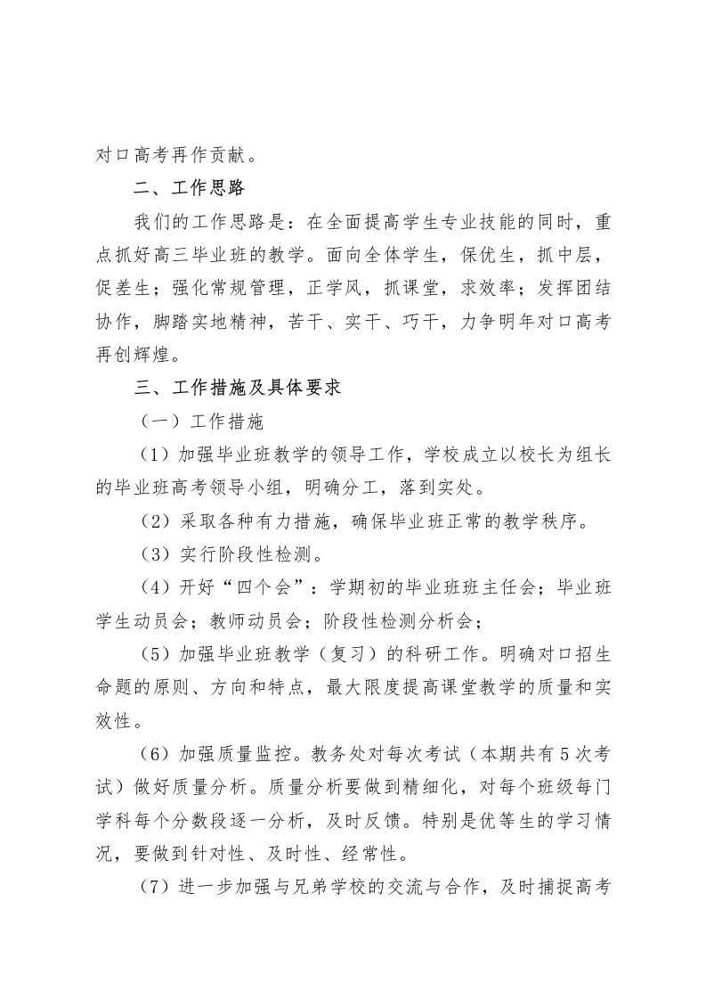 副校长在高三毕业班任课老师会议上的讲话各位领导、老师们,大家好!首先我代表教务处向奋战在毕业班一线的各位老师表示亲切慰问和诚挚的感谢!毕业班工作是学校整体教学水平的集中体现,抓好毕业班的工作非常重要,学校非常重视毕业班的工作,我们选择在今天召开本届毕业班任课教师会议,就是旨在统一思想,统一步调,明确目标,确定措施,增添信心,为决胜20xx年高考给老师们鼓劲、加油!一、分析情况1、本届毕业班共有X个班。共有在读学生Xx人。其中…。2、学生基础差,有极少数学生学习目的不明确,学习兴趣不浓,动力不足,个别学生外去上网。因此,如何调动学生的学习积极性,以点带面,突出重点,培养尖子生,来搞好复习迎考工作,是值得每位老师深思的一个问题。3、本届毕业班师资构成我们有一个团结奋斗、忘我工作、乐于奉献的教师群体。学校基于这样的考虑,每届安排的高三教师是经过认真挑选的,都是教学能力强、富有责任心的教师,全部是我们学校教学骨干,业务能手。学校把毕业班这副重担交给各位,这既是学校对大家的信任,也有学生、家长对大家的期待,我们应该挑起重担,负起责任,忘我工作,为学校教学质量提高、为20xx年