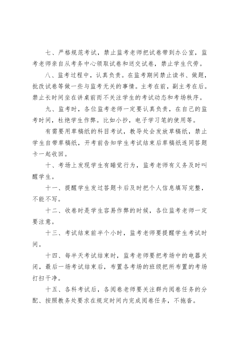 副校长在考试考务会上发言你们的辛苦能给学生们带来一个公正公平的竞争环境各位同事:又要辛苦大家了!恰是你们的辛苦能给学校营造好的考风,有了好的考风,进而促进我校好的教风;也恰是你们的辛苦能给学生们带来一个公正公平的竞争环境。所以还是要多辛苦大家!为此,我再强调考试过程中需要注意的一些细节。一、考试前各班班主任要在班级召开诚信考试以及考风考纪会议,要求学生诚信考试、规范答题,力争高分。二、按时监考。按照教导处要求的考试时间(上、下午的第一场提前30分钟)、在家长学校进行点名,按照学校监控室发出的发收试卷信号进行收发试卷和答题卡,不允许私自提前发卷考试或者延长考试时间。三、任何监考老师的手机不允许带到考场,请考试前自行存放好。四、开考前要用金属探测仪对学生进行违禁物品的排查,清除一切违禁物品。禁止学生把电子闹钟,手环、手表、电子笔,与考试有关的书籍等带入考场。五、所有监考教师持证监考,考试结束后监考证连同试卷、金属探测仪等一同送到考务室。六、考试开始前打开各考场的“诚信考试”课件。