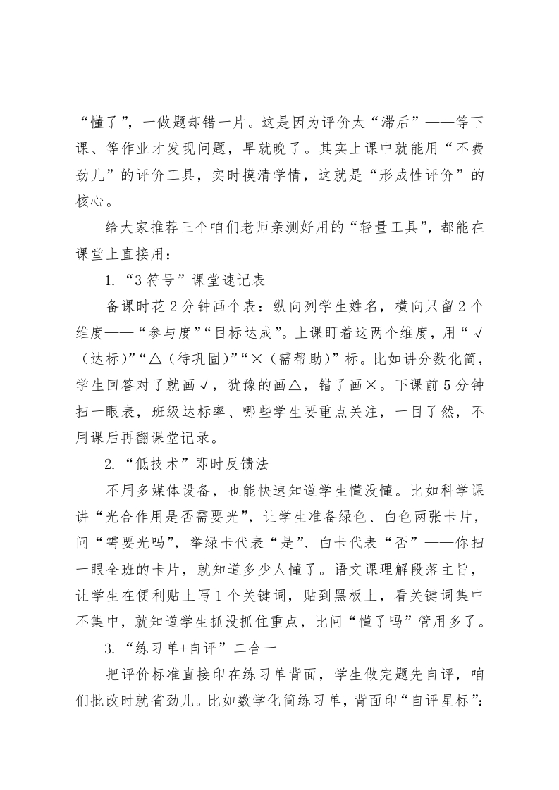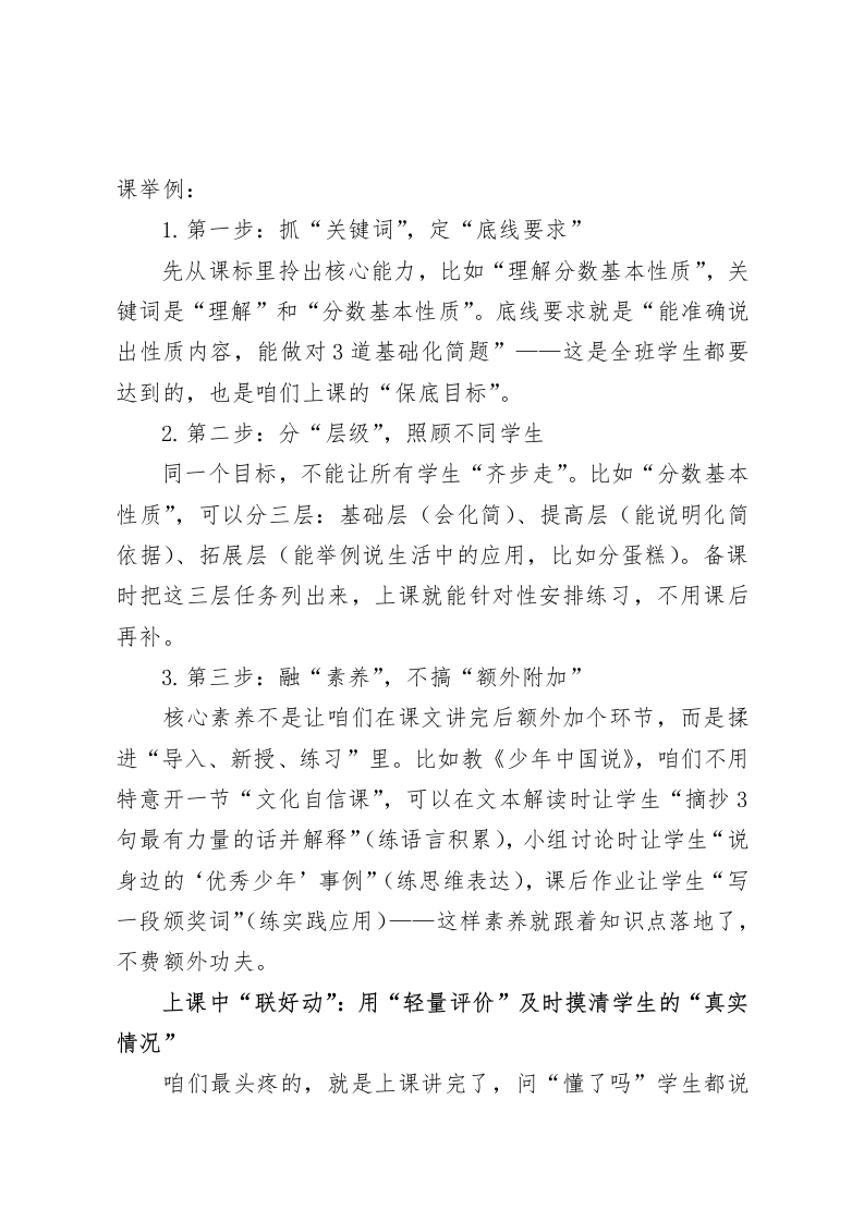 副校长在全体教师大会上的讲话:用“教学评一体化”破解日常教学的3个核心困惑各位老师,上午好!咱们每天走进课堂,其实都绕不开三个实际问题:备课时总怕“教偏”,不知道怎么把课标要求落到具体环节;上课中摸不准“学情”,不清楚学生是真懂还是假懂;课后想辅导又没“方向”,只能等着单元考、期末考才发现问题。这些困惑,本质上是“教、学、评”三张皮的问题一一教归教、学归学、评归评,没拧成一股绳。今天咱们不聊空理论,就聚焦日常教学的“备课、上课、课后”三个场景,聊聊怎么用“教学评一体化”把这三个困惑解开。它不是给大家额外加活,而是帮咱们找个“抓手”,让课教得更准、学生学得更明、辅导更对症,最终让课堂效果从“凭感觉”变成“看得见、摸得着”。备课时“立好标”:把“课标+素养”拆成可操作的“小目标”很多老师备课时,会把课标里的“了解”“掌握”直接抄成教学目标,比如“掌握记叙文写作方法”“理解分数基本性质”。但到了上课,又会纠结“到底让学生做到什么程度才算掌握”?这就是目标没“落地”一一咱们得把抽象的课标,拆成能直接用在课堂上的“微观任务”。这里给大家一个原创的“课标拆解三步法”,咱们拿日常备