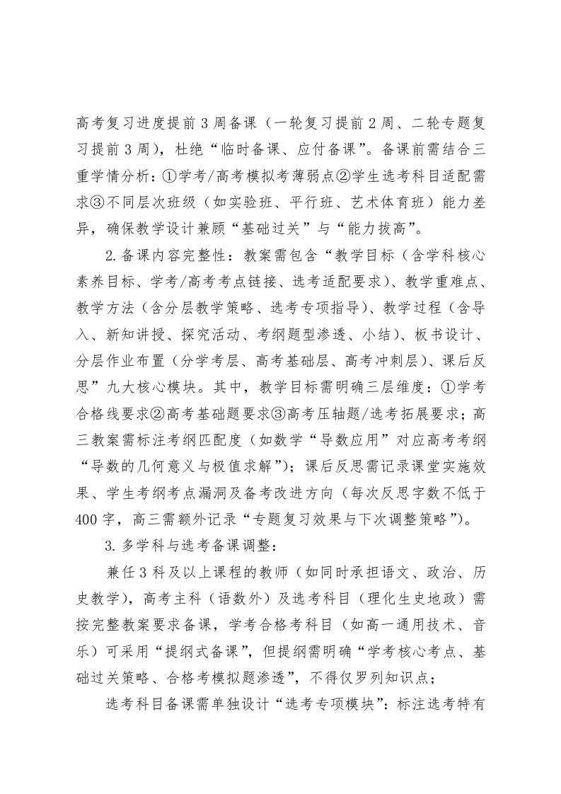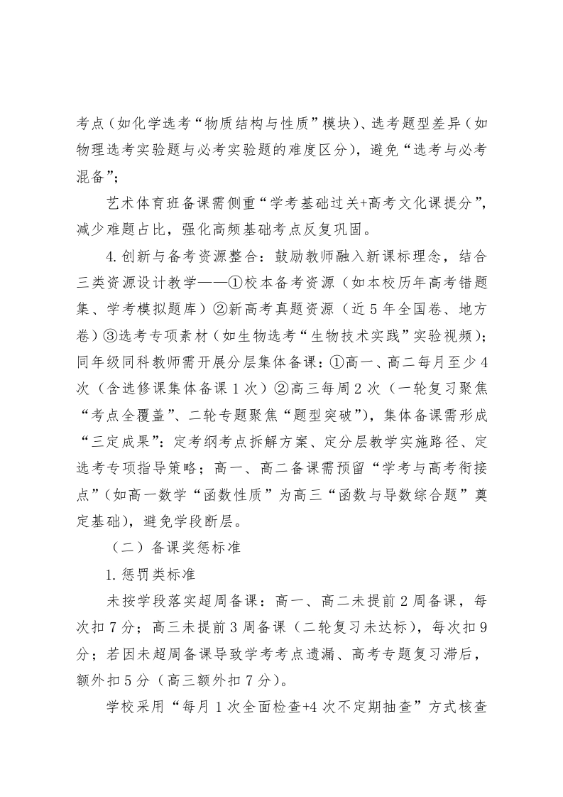 高中教师常规管理奖惩制度(2025修订版)总则为深入贯彻《普通高中课程方案(2017年版2020年修订)》《中小学教师职业行为十项准则》要求,落实高中阶段“夯实学科基础、培育核心素养、衔接高考与学考”的育人目标,进一步加强学校教学常规管理,规范教师工作作风,激发教师专业发展内生动力,提升课堂教学效率与中高考备考质量,结合本校办学规模、师资结构及高中教学实际需求(含高一至高三学段差异、高考/学考分层要求、选修课教学特点),特制定本制度。本制度适用于本校全体在职专任教师,涵盖备课、作业管理两大核心教学环节,通过量化考核与质性评价相结合的方式,实现“以奖促优、以惩促改”的管理目标,助力构建高质量高中教师发展体系。一、备课管理奖惩细则高中备课需兼顾学考基础达标、高考能力突破,既要落实学科核心素养,又要适配新高考选考模式。本细则围绕“对标考纲、分层精准、考教融合”原则,明确备课要求与奖惩标准,推动教师从“备教材”向“备学情、备考纲、备分层、备选考”转变。(一)备课基本要求1.超周备课规范:按学段差异化要求落实超周备课一一高一、高二需提前2周完成备课(含必修课、选修课),高三结合